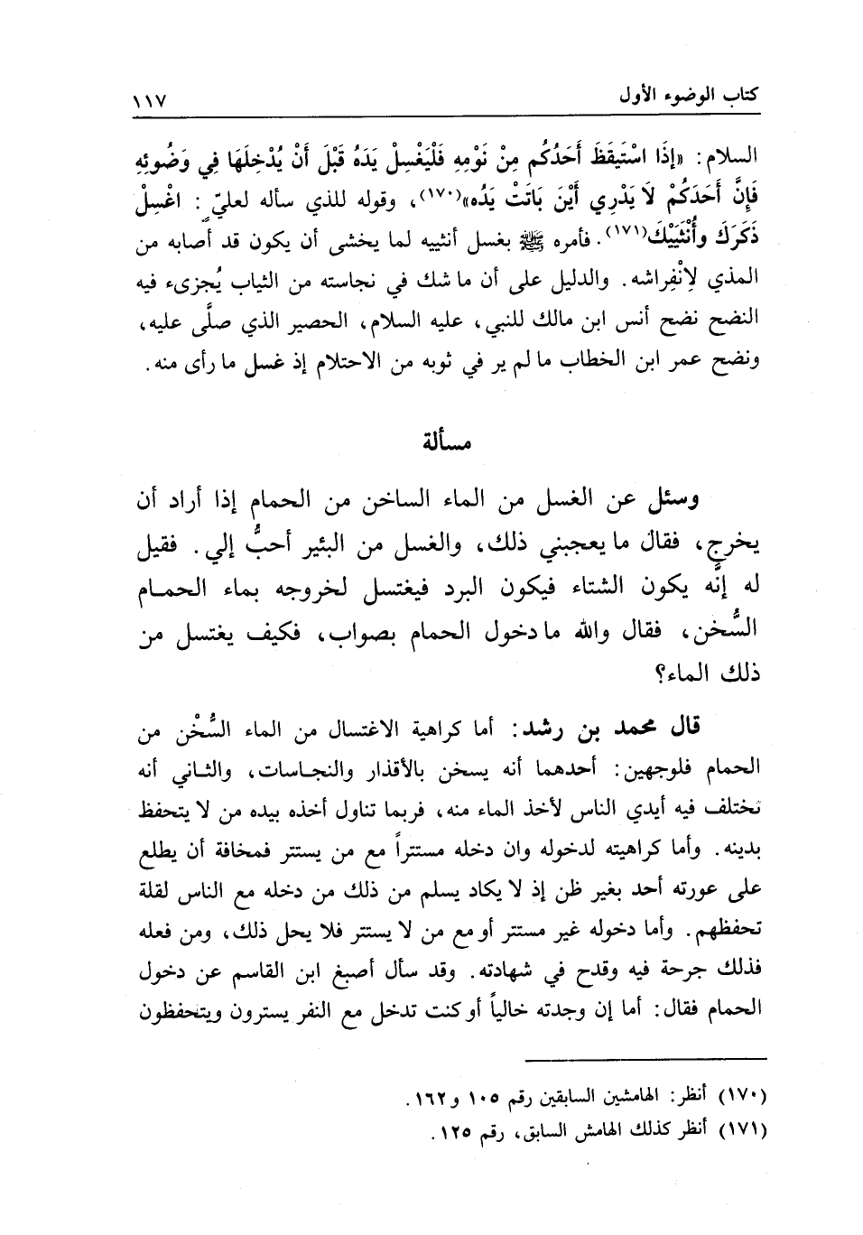 قال محمد بن رشد: أما كراهية الاغتسال من الماء السخن من الحمام فلوجهين: أحدهما: أنه يسخن بالأقذار والنجاسات، والثاني: أنه تختلف فيه أيدي الناس لأخذ الماء منه، فربما تناول أخذه بيده من لا يتحفظ بدينه. وأما كراهيته لدخوله وإن دخله مستترا مع من يستتر فمخافة أن يطلع على عورته أحد بغير ظن؛ إذ لا يكاد يسلم من ذلك من دخله مع الناس لقلة تحفظهم. وأما دخوله غير مستتر أو مع من لا يستتر فلا يحل ذلك، ومن فعله فذلك جرحة فيه وقدح في شهادته. وقد سأل أصبغُ ابنَ القاسم عن دخول الحمام، فقال: أما إن وجدته خاليا أو كنت تدخل مع النفر يسترون ويتحفظون