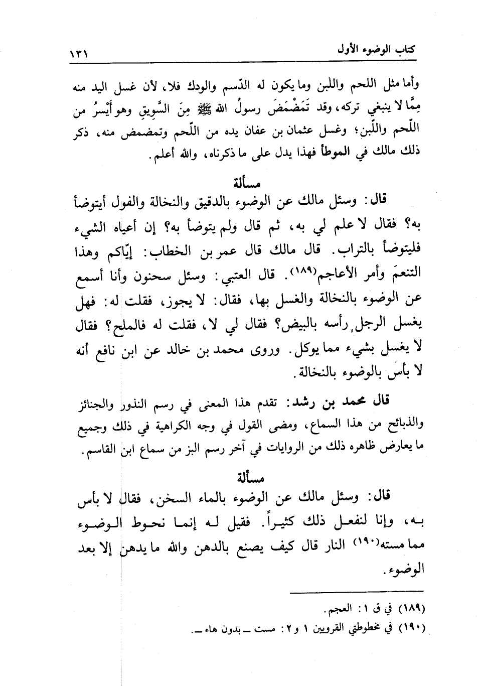 مسألة قال: وسئل مالك عن الوضوء بالماء السخن، فقال: لا بأس به، وإنا لنفعل ذلك كثيرا، فقيل له: إنما نحوط الوضوء مما مسته النار، قال: كيف يصنع بالدهن، والله ما يدهن إلا بعد الوضوء.