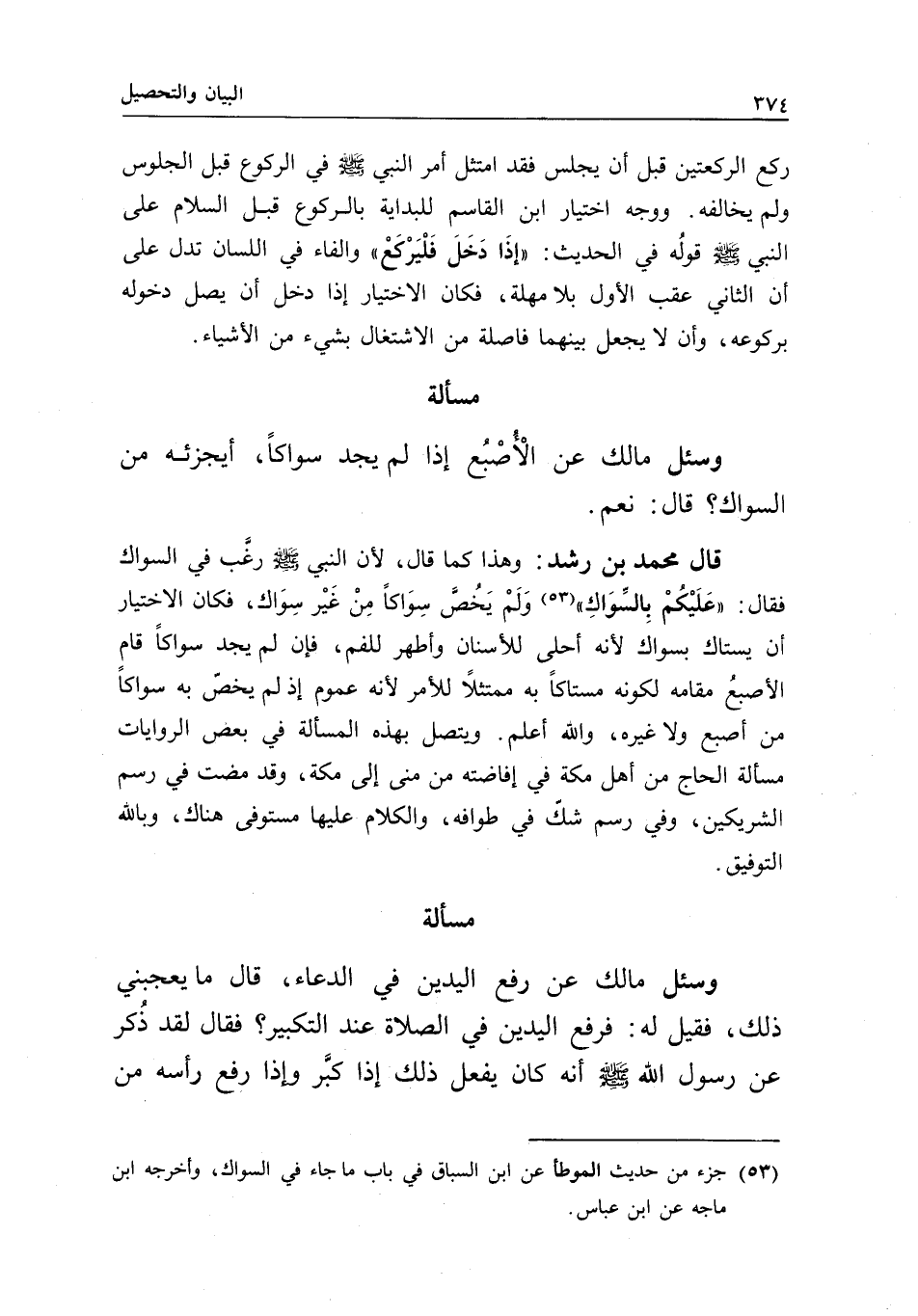 قال محمد بن رشد: وهذا كما قال؛ لأن النبي - صَلَّى اللَّهُ عَلَيْهِ وَسَلَّمَ - رغب في السواك فقال: «عليكم بالسواك» ولم يخص سواكا من غير سواك، فكان الاختيار أن يستاك بسواك لأنه أحلى للأسنان وأطهر للفم، فإن لم يجد سواكا قام الأصبع مقامه لكونه مستاكا به ممتثلا للأمر لأنه عموم إذ لم يخص به سواكا من أصبع ولا غيره، والله أعلم.