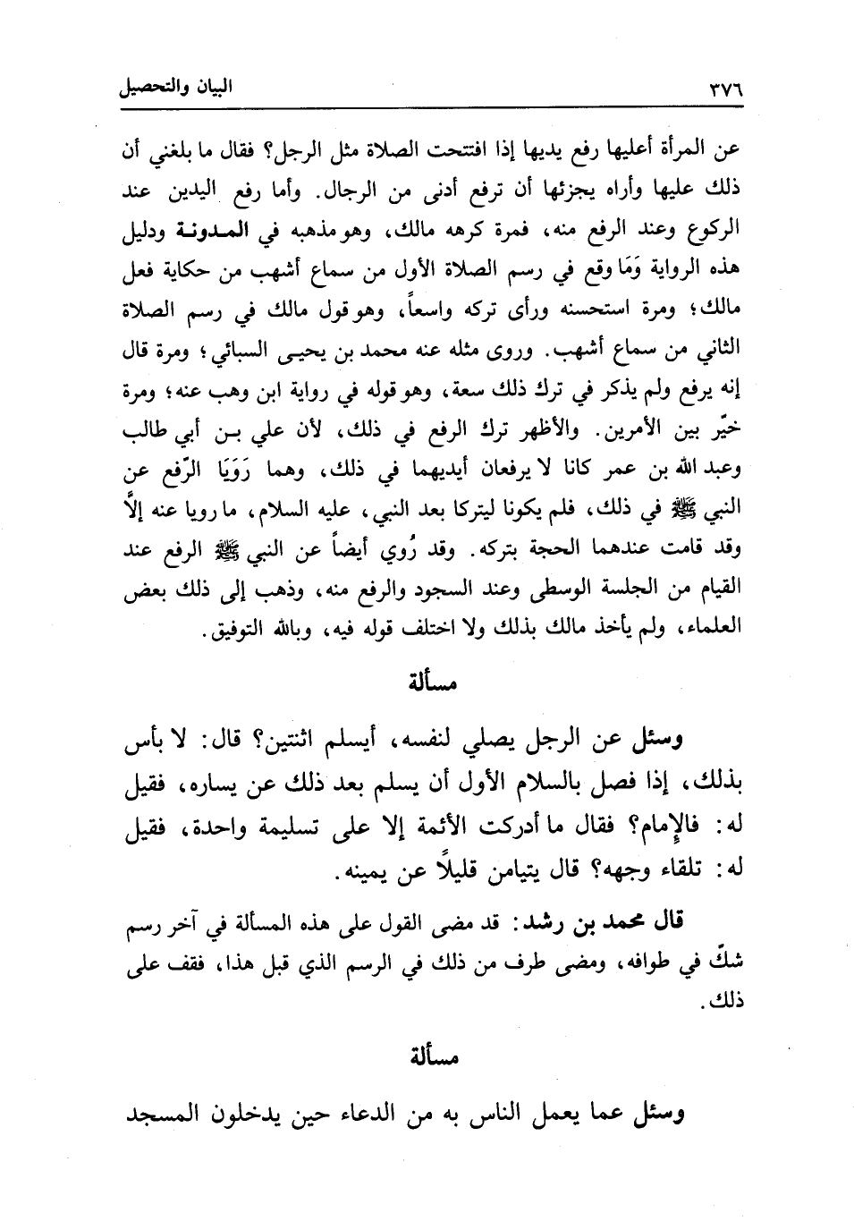 عن المرأة أعليها رفع يديها إذا افتتحت الصلاة مثل الرجل؟ فقال ما بلغني أن ذلك عليها وأراه يجزئها أن ترفع أدنى من الرجال. وأما رفع اليدين عند الركوع وعند الرفع منه، فمرة كرهه مالك، وهو مذهبه في المدونة ودليل هذه الرواية وما وقع في رسم "الصلاة" الأول من سماع أشهب من حكاية فعل مالك؛ ومرة استحسنه ورأى تركه واسعا، وهو قول مالك في رسم "الصلاة" الثاني من سماع أشهب.