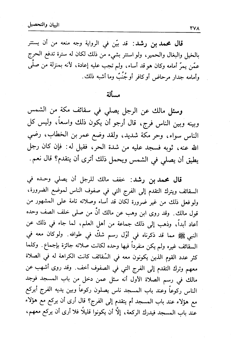 مسألة وسئل مالك عن الرجل يصلي في سقائف مكة من الشمس وبينه وبين الناس فرج، قال أرجو أن يكون ذلك واسعا، وليس كل الناس سواء، وحر مكة شديد، ولقد وضع عمر بن الخطاب، - رَضِيَ اللَّهُ عَنْهُ -، ثوبه فسجد عليه من شدة الحر، فقيل له: فإن كان رجل يطيق أن يصلي في الشمس ويحمل ذلك أترى أن يتقدم؟ قال نعم.