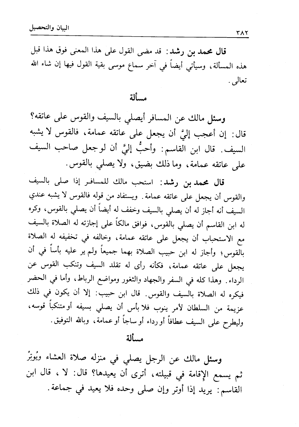 قال محمد بن رشد: استحب مالك للمسافر إذا صلى بالسيف والقوس أن يجعل على عاتقه عمامة. ويستفاد من قوله فالقوس لا يشبه عندي السيف أنه أجاز له أن يصلي بالسيف وخفف له أيضا أن يصلي بالقوس، وكره له ابن القاسم أن يصلي بالقوس، فوافق مالكا على إجازته له الصلاة بالسيف مع الاستحباب أن يجعل على عاتقه عمامة، وخالفه في تخفيفه له الصلاة بالقوس؛ وأجاز له ابن حبيب الصلاة بهما جميعا، ولم ير عليه بأسا في أن يجعل على عاتقه عمامة، فكأنه رأى له تقلد السيف وتنكب القوس عن الرداء.