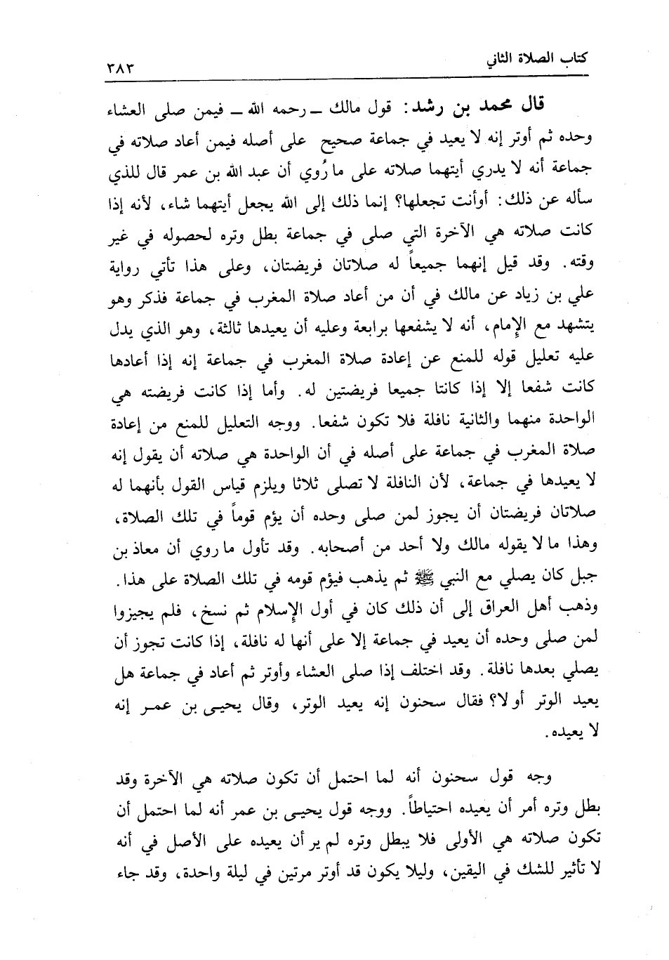 قال محمد بن رشد: قول مالك - رَحِمَهُ اللَّهُ - فيمن صلى العشاء وحده ثم أوتر: إنه لا يعيد في جماعة صحيح على أصله فيمن أعاد صلاته في جماعة أنه لا يدري أيتهما صلاته على ما روي أن عبد الله بن عمر قال للذي سأله عن ذلك: أو أنت تجعلها؟ إنما ذلك إلى الله يجعل أيتهما شاء؛ لأنه إذا كانت صلاته هي الآخرة التي صلى في جماعة بطل وتره لحصوله في غير وقته.