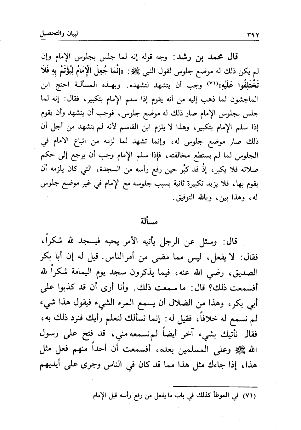 مسألة قال: وسئل عن الرجل يأتيه الأمر يحبه فيسجد لله شكرا، فقال: لا يفعل، ليس مما مضى من أمر الناس، قيل له: إن أبا بكر الصديق - رَضِيَ اللَّهُ عَنْهُ - فيما يذكرون سجد يوم اليمامة شكرا الله، أفسمعت ذلك؟ قال: ما سمعت ذلك، وأنا أرى أن قد كذبوا على أبي بكر، وهذا من الضلال أن يسمع المرء الشيء فيقول: هذا شيء لم نسمع له خلافا، فقيل له: إنما نسألك لنعلم رأيك فنرد ذلك به، فقال: نأتيك بشيء آخر أيضا لم نسمعه مني، قد فتح على رسول الله - صَلَّى اللَّهُ عَلَيْهِ وَسَلَّمَ - وعلى المسلمين بعده، أفسمعت أن أحدا منهم فعل مثل هذا، إذا جاءك مثل هذا مما قد كان في الناس وجرى على أيديهم