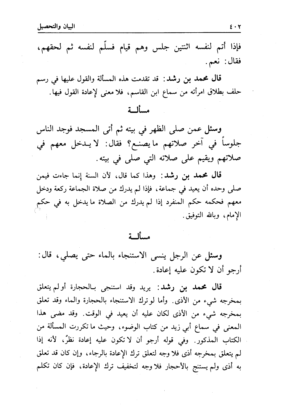 قال محمد بن رشد: يريد وقد استنجى بالحجارة أو لم يتعلق بمخرجه شيء من الأذى، وأما لو ترك الاستنجاء بالحجارة والماء وقد تعلق بمخرجه شيء من الأذى لكان عليه أن يعيد في الوقت، وقد مضى هذا المعنى في سماع أبي زيد من كتاب الوضوء، وحيث ما تكررت المسألة من الكتاب المذكور. وفي قوله: أرجو أن لا تكون عليه إعادة نظر؛ لأنه إذا لم يتعلق بمخرجه أذى فلا وجه لتعلق ترك الإعادة بالرجاء، وإن كان قد تعلق به أذى ولم يستنج بالأحجار فلا وجه لتخفيف ترك الإعادة، فإن كان تكلم