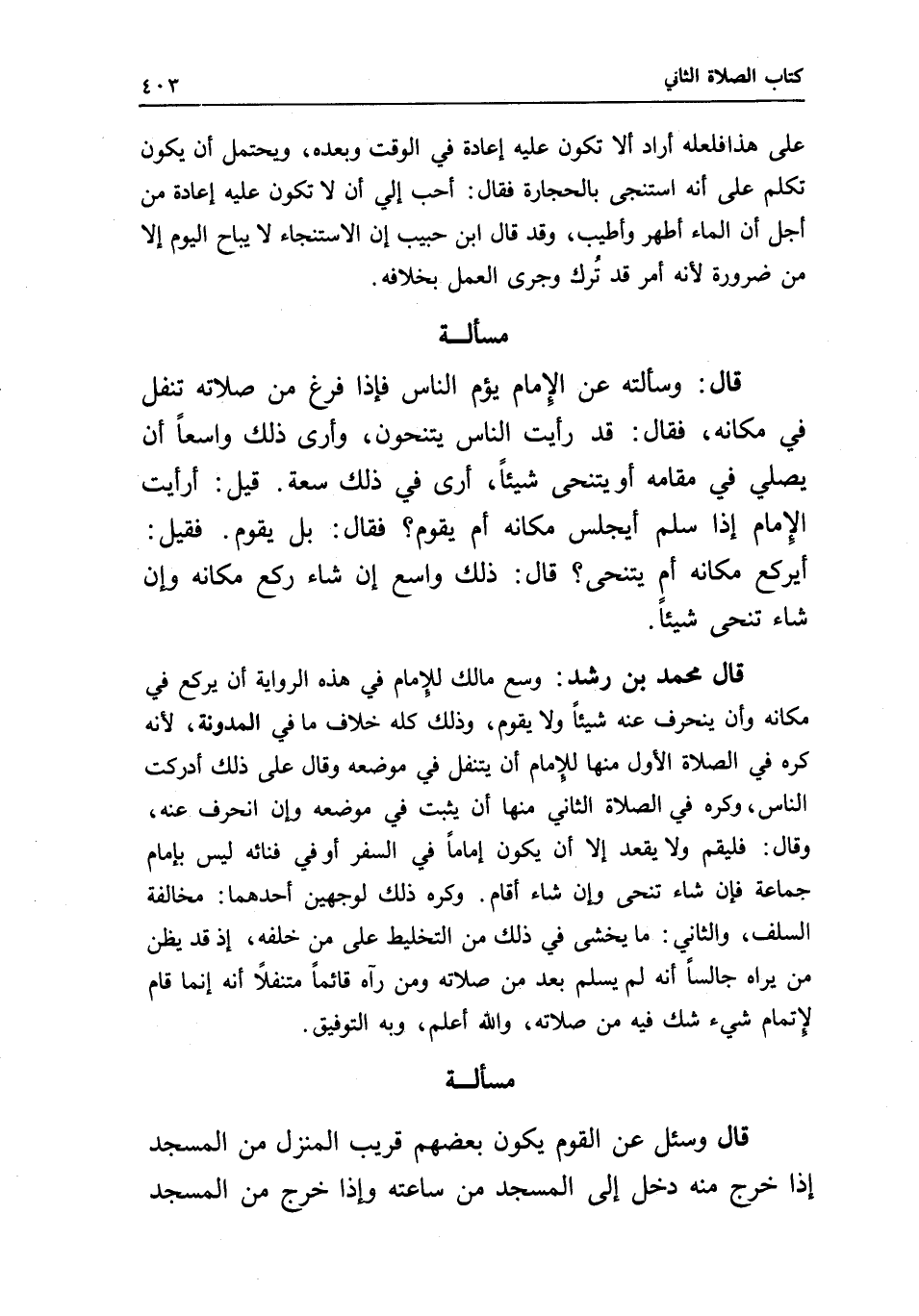 مسألة قال: وسألته عن الإمام يؤم الناس فإذا فرغ من صلاته تنفل في مكانه، فقال: قد رأيت الناس يتنحون، وأرى ذلك واسعا أن يصلي في مقامه أو يتنحى شيئا، أرى في ذلك سعة، قيل: أرأيت الإمام إذا سلم أيجلس مكانه أم يقوم؟ فقال: بل يقوم، فقيل: أيركع مكانه أم يتنحى؟ قال: ذلك واسع، إن شاء ركع مكانه وإن شاء تنحى شيئا.