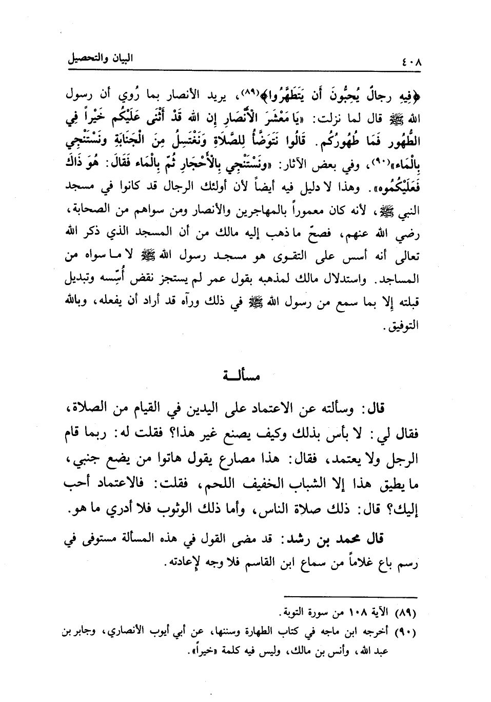 {فِيهِ رِجَالٌ يُحِبُّونَ أَنْ يَتَطَهَّرُوا} [التوبة: 108] ، يريد الأنصار بما روي «أن رسول الله - صَلَّى اللَّهُ عَلَيْهِ وَسَلَّمَ - قال لما نزلت: "يا معشر الأنصار، إن الله قد أثنى عليكم خيرا في الطهور فما طهوركم، قالوا: نتوضأ للصلاة، ونغتسل من الجنابة، ونستنجي بالماء» ، وفي بعض الآثار: «ونستنجي بالأحجار ثم بالماء، فقال: هو ذاك فعليكموه» . وهذا لا دليل فيه أيضا؛ لأن أولئك الرجال قد كانوا في مسجد النبي - صَلَّى اللَّهُ عَلَيْهِ وَسَلَّمَ - لأنه كان معمورا بالمهاجرين والأنصار ومن سواهم من الصحابة - رَضِيَ اللَّهُ عَنْهُمْ -، فصح ما ذهب إليه مالك من أن المسجد الذي ذكر الله تعالى أنه أسس على التقوى هو مسجد رسول الله - صَلَّى اللَّهُ عَلَيْهِ وَسَلَّمَ - لا ما سواه من المساجد، واستدلال مالك لمذهبه بقول عمر لم يستجز نقض أسسه وتبديل قبلته إلا بما سمع من رسول الله - صَلَّى اللَّهُ عَلَيْهِ وَسَلَّمَ - في ذلك ورآه قد أراد أن يفعله، وبالله التوفيق.