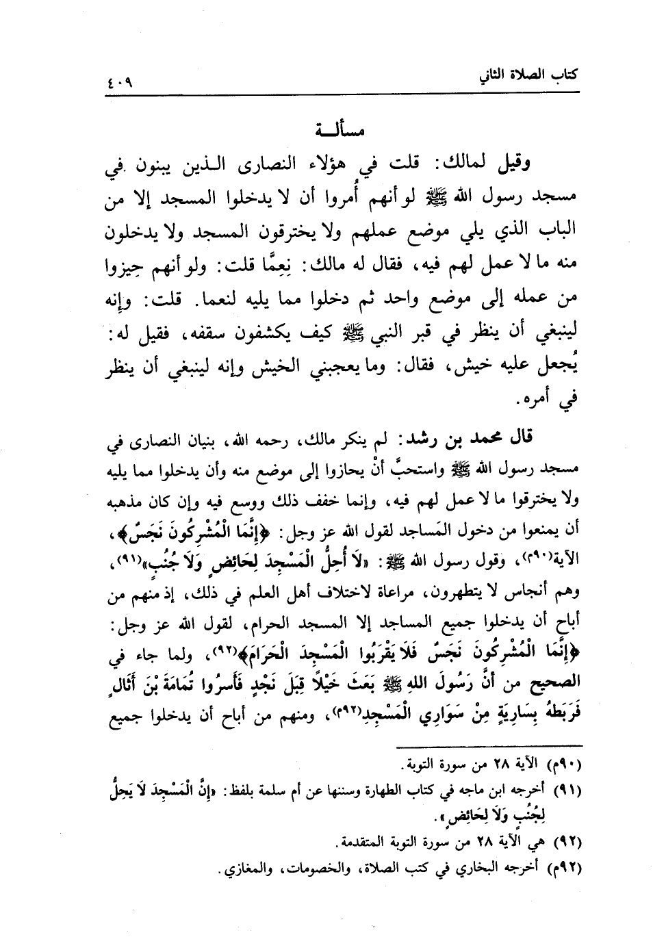 قال محمد بن رشد: لم ينكر مالك - رَحِمَهُ اللَّهُ - بنيان النصارى في مسجد رسول الله - صَلَّى اللَّهُ عَلَيْهِ وَسَلَّمَ - واستحث أن يحازوا إلى موضع منه وأن يدخلوا مما يليه ولا يخترقوا ما لا عمل لهم فيه، وإنما خفف ذلك ووسع فيه وإن كان مذهبه أن يمنعوا من دخول المساجد؛ لقول الله -عز وجل-: {إِنَّمَا الْمُشْرِكُونَ نَجَسٌ} [التوبة: 28] ، الآية، وقول رسول الله - صَلَّى اللَّهُ عَلَيْهِ وَسَلَّمَ -: «لا أحل المسجد لحائض ولا جنب» وهم أنجاس لا يتطهرون، مراعاة لاختلاف أهل العلم في ذلك، إذ منهم من أباح أن يدخلوا جميع المساجد إلا المسجد الحرام؛ لقول الله -عز وجل-: {إِنَّمَا الْمُشْرِكُونَ نَجَسٌ فَلا يَقْرَبُوا الْمَسْجِدَ الْحَرَامَ} [التوبة: 28] ، ولما جاء في الصحيح من «أن رسول الله - صَلَّى اللَّهُ عَلَيْهِ وَسَلَّمَ - بعث خيلا قبل نجد، فأسروا ثمامة بن أثال، فربطه بسارية من سواري المسجد» ومنهم من أباح أن يدخلوا جميع