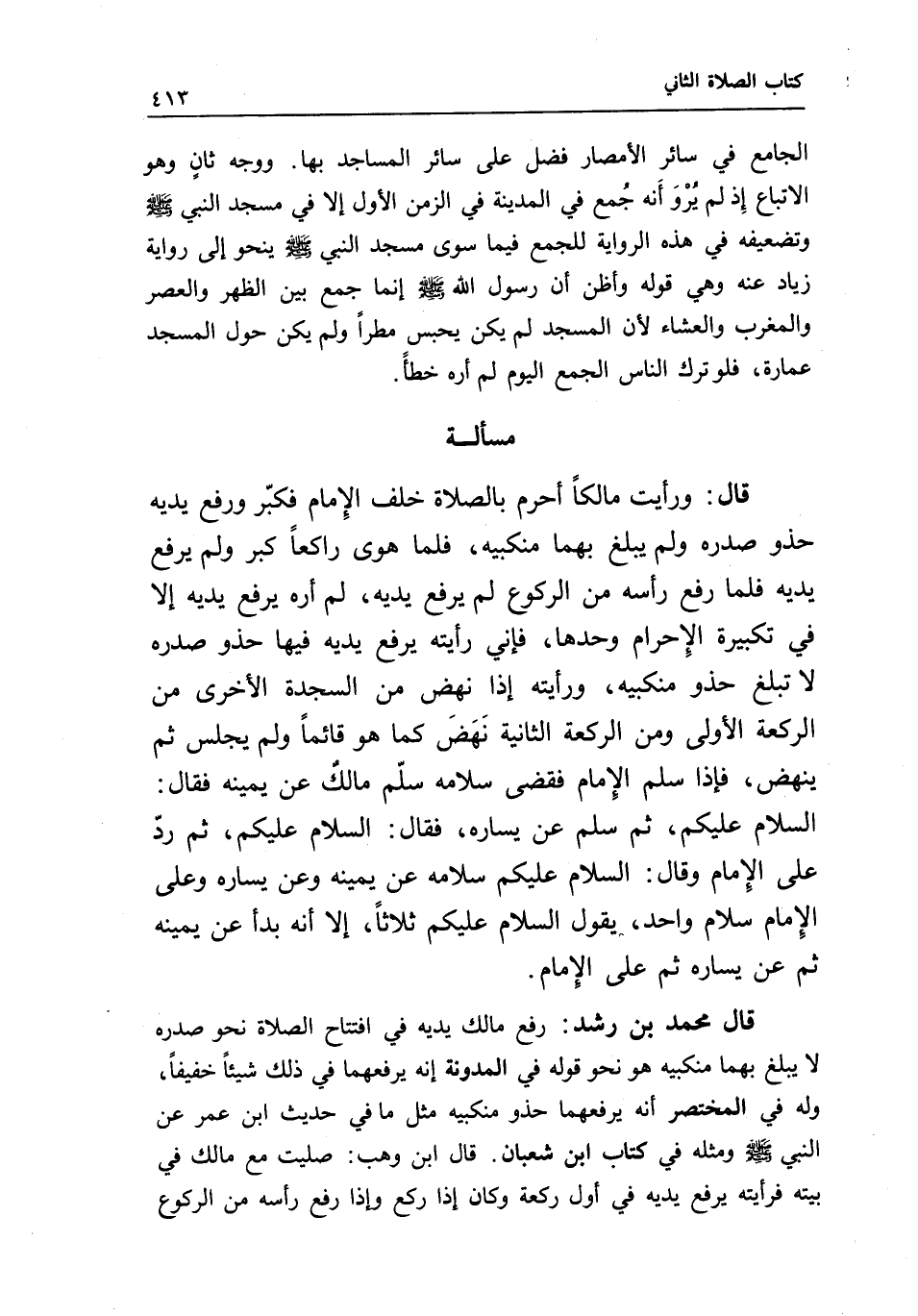 مسألة قال: ورأيت مالكا أحرم بالصلاة خلف الإمام، فكبر ورفع يديه حذو صدره ولم يبلغ بهما منكبيه، فلما هوى راكعا كبر ولم يرفع يديه، فلما رفع رأسه من الركوع لم يرفع يديه، لم أره يرفع يديه إلا في تكبيرة الإحرام وحدها، فإني رأيته يرفع يديه فيها حذو صدره لا تبلغ حذو منكبيه، ورأيته إذا نهض من السجدة الأخرى من الركعة الأولى ومن الركعة الثانية نهض كما هو قائما ولم يجلس ثم ينهض، فإذا سلم الإمام فقضى سلامه سلم مالك عن يمينه، فقال: السلام عليكم، ثم سلم عن يساره، فقال: السلام عليكم، ثم رد على الإمام وقال: السلام عليكم، سلامه عن يمينه وعن يساره وعلى الإمام سلام واحد، يقول: السلام عليكم، ثلاثا، إلا أنه بدأ عن يمينه ثم عن يساره ثم على الإمام.