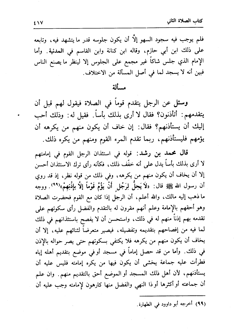 مسألة وسئل عن الرجل يتقدم قوما في الصلاة فيقول لهم قبل أن يتقدمهم: أتأذنون؟ فقال: لا أرى بذلك بأسا، فقيل له: وذلك أحب إليك أن يستأذنهم؟ فقال: إن خاف أن يكون منهم من يكرهه أن يؤمهم فليستأذنهم، ربما تقدم المرء القوم ومنهم من يكره ذلك.