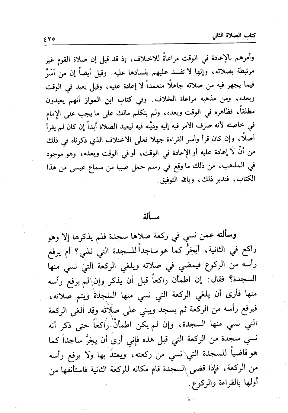 مسألة وسألته عمن نسي في ركعة صلاها سجدة فلم يذكرها إلا وهو راكع في الثانية، أيخر كما هو ساجدا للسجدة التي نسي؟ أم يرفع رأسه من الركوع، فيمضي في صلاته ويلغي الركعة التي نسي منها السجدة؟ فقال: إن اطمأن راكعا قبل أن يذكر وإن لم يرفع رأسه منها فأرى أن يلغي الركعة التي نسي منها السجدة ويتم صلاته، فيرفع رأسه من الركعة ثم يسجد ويبني على صلاته وقد ألغى الركعة التي نسي منها السجدة، وإن لم يكن اطمأن راكعا حتى ذكر أنه نسي سجدة من الركعة التي قبل هذه، فإني أرى أن يخر ساجدا كما هو قاضيا للسجدة التي نسي من ركعته، ويعتد بها ولا يرفع رأسه من الركعة، فإذا قضى السجدة قام مكانه للركعة الثانية فاستأنفها من أولها بالقراءة والركوع.