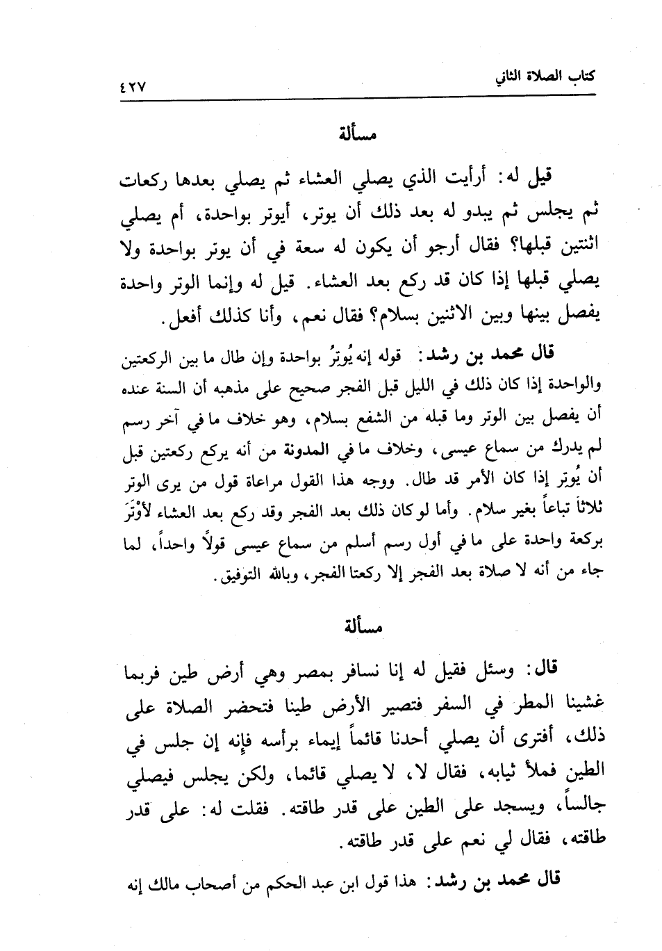مسألة قيل له: أرأيت الذي يصلي العشاء ثم يصلي بعدها ركعات، ثم يجلس، ثم يبدو له بعد ذلك أن يوتر، أيوتر بواحدة أم يصلي اثنتين قبلها؟ فقال: أرجو أن يكون له سعة في أن يوتر بواحدة ولا يصلي قبلها إذا كان قد ركع بعد العشاء. قيل له: وإنما الوتر واحدة يفصل بينها وبين الاثنين بسلام؟ فقال: نعم، وأنا كذلك أفعل.