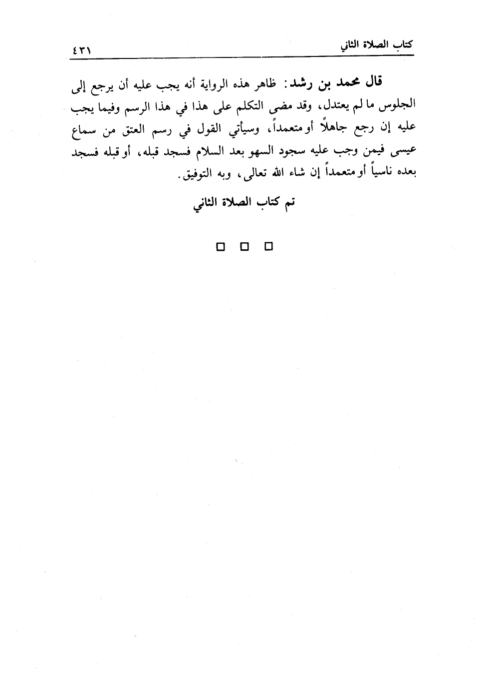 قال محمد بن رشد: ظاهر هذه الرواية أنه يجب عليه أن يرجع إلى الجلوس ما لم يعتدل، وقد مضى التكلم على هذا في هذا الرسم، وفيما يجب عليه إن رجع جاهلا أو متعمدا، وسيأتي القول في رسم "العتق" من سماع عيسى فيمن وجب عليه سجود السهو بعد السلام فسجد قبله أو قبله فسجد بعده ناسيا أو متعمدا إن شاء الله تعالى، وبه التوفيق.
