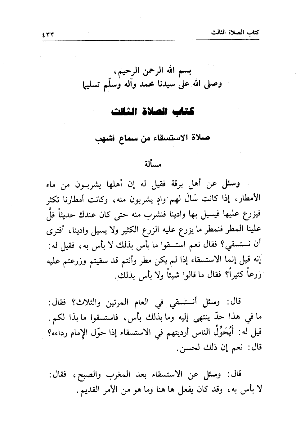 صلاة الاستسقاء من سماع أشهب مسألة وسئل عن أهل برقة فقيل له: إن أهلها يشربون من ماء الأمطار، إذا كانت سال لهم واد يشربون منه، وكانت أمطارنا تكثر فيزرع عليها، فيسيل بها وادينا فنشرب منه، حتى كان عندك حديثا قل علينا المطر، فنمطر ما يزرع عليه الزرع الكثير ولا يسيل وادينا، أفترى أن نستسقي؟ فقال: نعم استسقوا، ما بأس بذلك لا بأس به، فقيل له: إنه قيل: إنما الاستسقاء إذا لم يكن مطر وأنتم قد سقيتم وزرعتم عليه زرعا كثيرا؟ فقال: ما قالوا شيئا ولا بأس بذلك.