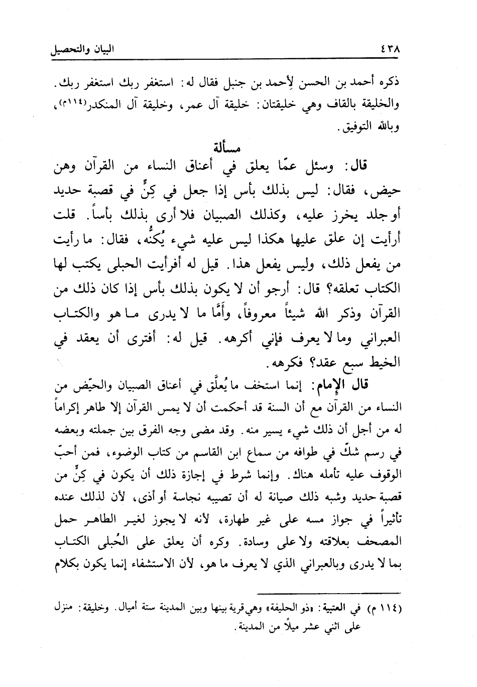 مسألة قال: وسئل عما يعلق في أعناق النساء من القرآن وهن حيض، فقال: ليس بذلك بأس إذا جعل في كن في قصبة حديد أو جلد يخرز عليه، وكذلك الصبيان فلا أرى بذلك بأسا. قلت: أرأيت إن علق عليها هكذا ليس عليه شيء يكنه، فقال: ما رأيت من يفعل ذلك، وليس يفعل هذا، قيل له: أفرأيت الحبلى يكتب لها الكتاب تعلقه؟ قال: أرجو أن لا يكون بذلك بأس إذا كان ذلك من القرآن وذكر الله شيئا معروفا، وأما ما لا يدرى ما هو والكتاب العبراني وما لا يعرف فإني أكرهه، قيل له: أفترى أن يعقد في الخيط سبع عقد؟ فكرهه.