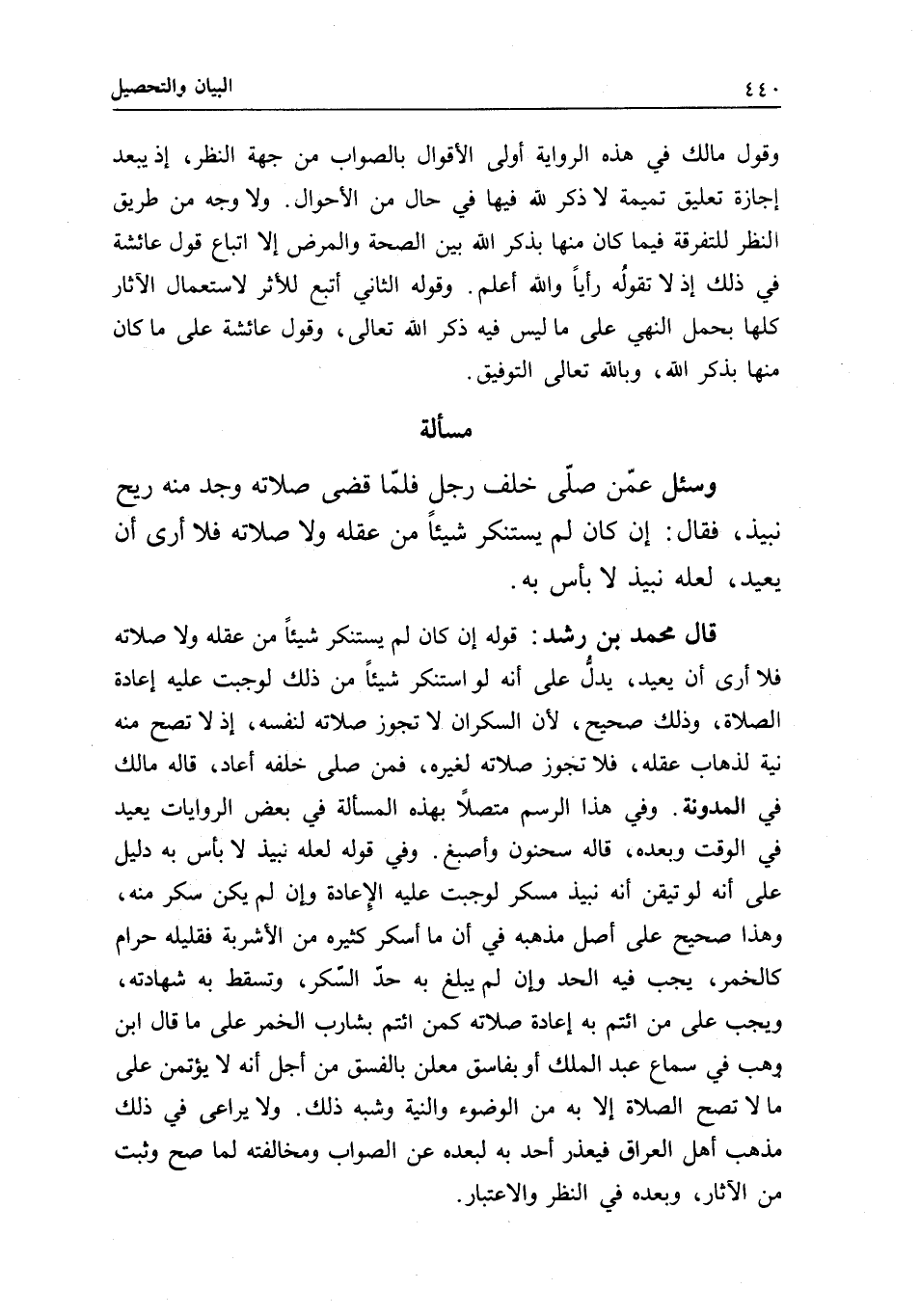 قال محمد بن رشد: قوله: إن كان لم يستنكر شيئا من عقله ولا صلاته فلا أرى أن يعيد، يدل على أنه لو استنكر شيئا من ذلك لوجبت عليه إعادة الصلاة، وذلك صحيح؛ لأن السكران لا تجوز صلاته لنفسه، إذ لا تصح منه نية؛ لذهاب عقله، فلا تجوز صلاته لغيره، فمن صلى خلفه أعاد، قاله مالك في " المدونة ". وفي هذا الرسم متصلا بهذه المسألة في بعض الروايات يعيد في الوقت وبعده، قاله سحنون وأصبغ، وفي قوله: لعله نبيذ لا بأس به دليل على أنه لو تيقن أنه نبيذ مسكر لوجبت عليه الإعادة وإن لم يكن سكر منه، وهذا صحيح على أصل مذهبه في أن ما أسكر كثيره من الأشربة فقليله حرام كالخمر، يجب فيه الحد وإن لم يبلغ به حد السكر، وتسقط به شهادته، ويجب على من ائتم به إعادة صلاته كمن أتم بشارب الخمر على ما قال ابن وهب في سماع عبد الملك أو بفاسق معلن بالفسق من أجل أنه لا يؤتمن على ما لا تصح الصلاة إلا به من الوضوء والنية وشبه ذلك، ولا يراعى في ذلك مذهب أهل العراق فيعذر أحد به؛ لبعده عن الصواب ومخالفته لما صح وثبت من الآثار، وبعده في النظر والاعتبار.
