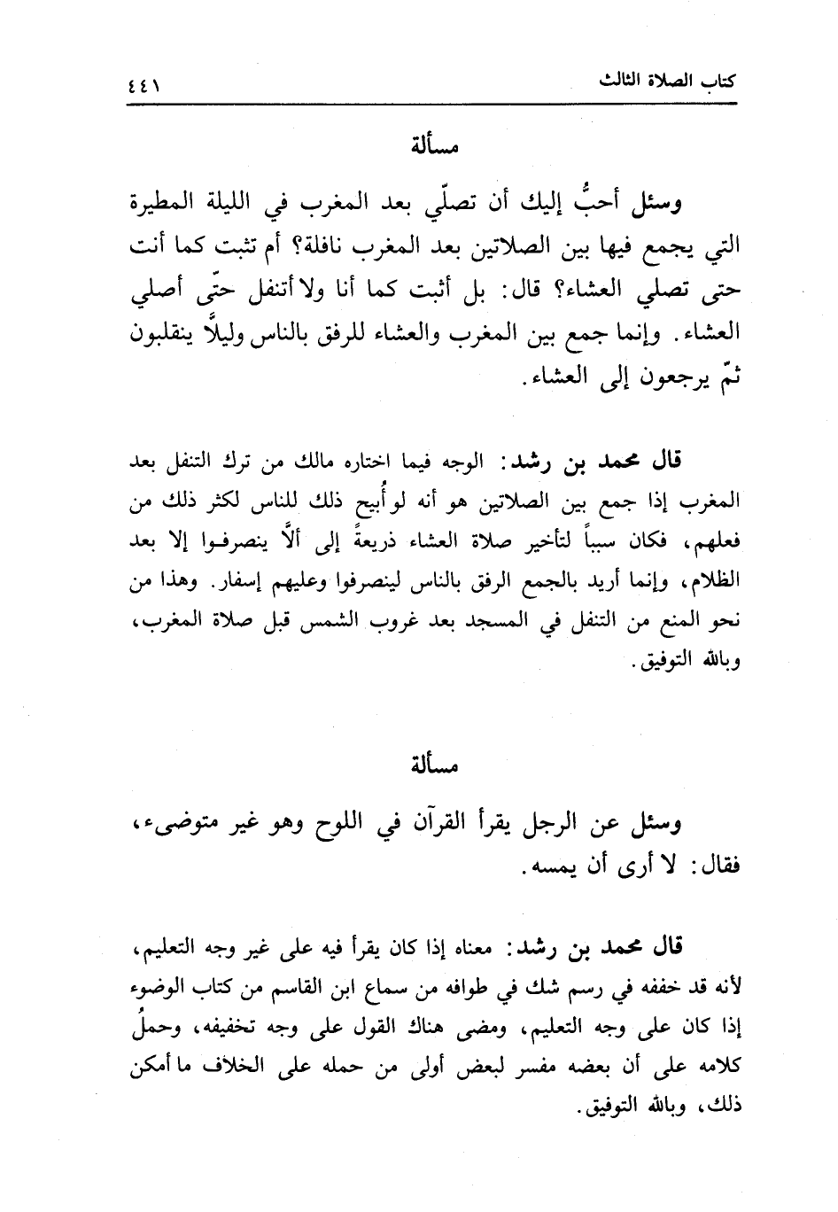 مسألة وسئل: أحب إليك أن تصلي بعد المغرب في الليلة المطيرة التي يجمع فيها بين الصلاتين بعد المغرب نافلة؟ أم تثبت كما أنت حتى تصلي العشاء؟ قال: بل أثبت كما أنا ولا أتنفل حتى أصلي العشاء. وإنما جمع بين المغرب والعشاء للرفق بالناس، ولئلا ينقلبوا ثم يرجعوا إلى العشاء.