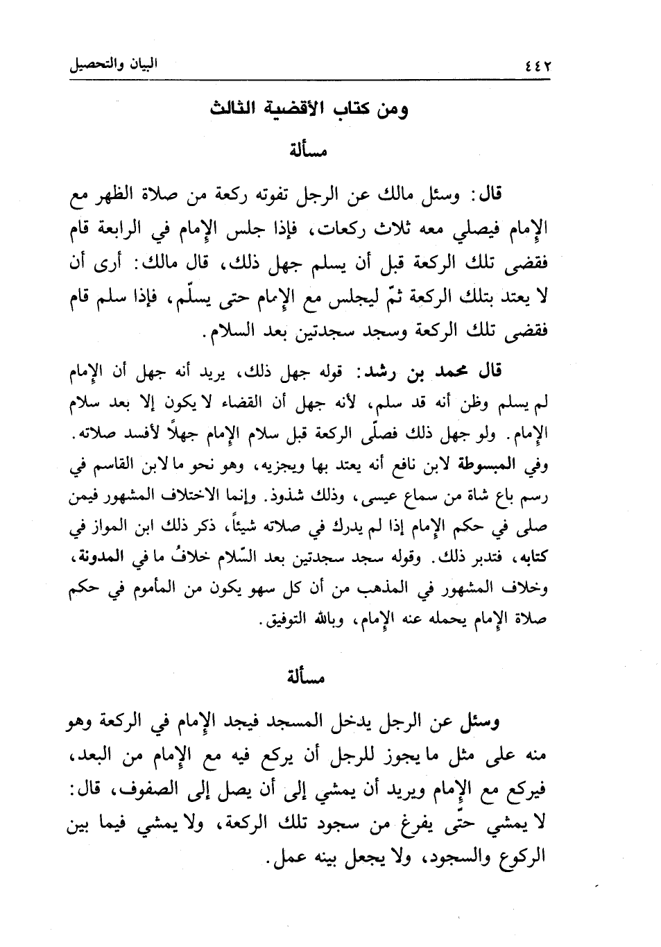 مسألة قال: وسئل مالك عن الرجل تفوته ركعة من صلاة الظهر مع الإمام، فيصلي معه ثلاث ركعات، فإذا جلس الإمام في الرابعة قام فقضى تلك الركعة قبل أن يسلم، جهل ذلك، قال مالك: أرى أن لا يعتد بتلك الركعة، ثم ليجلس مع الإمام حتى يسلم، فإذا سلم قام فقضى تلك الركعة وسجد سجدتين بعد السلام.