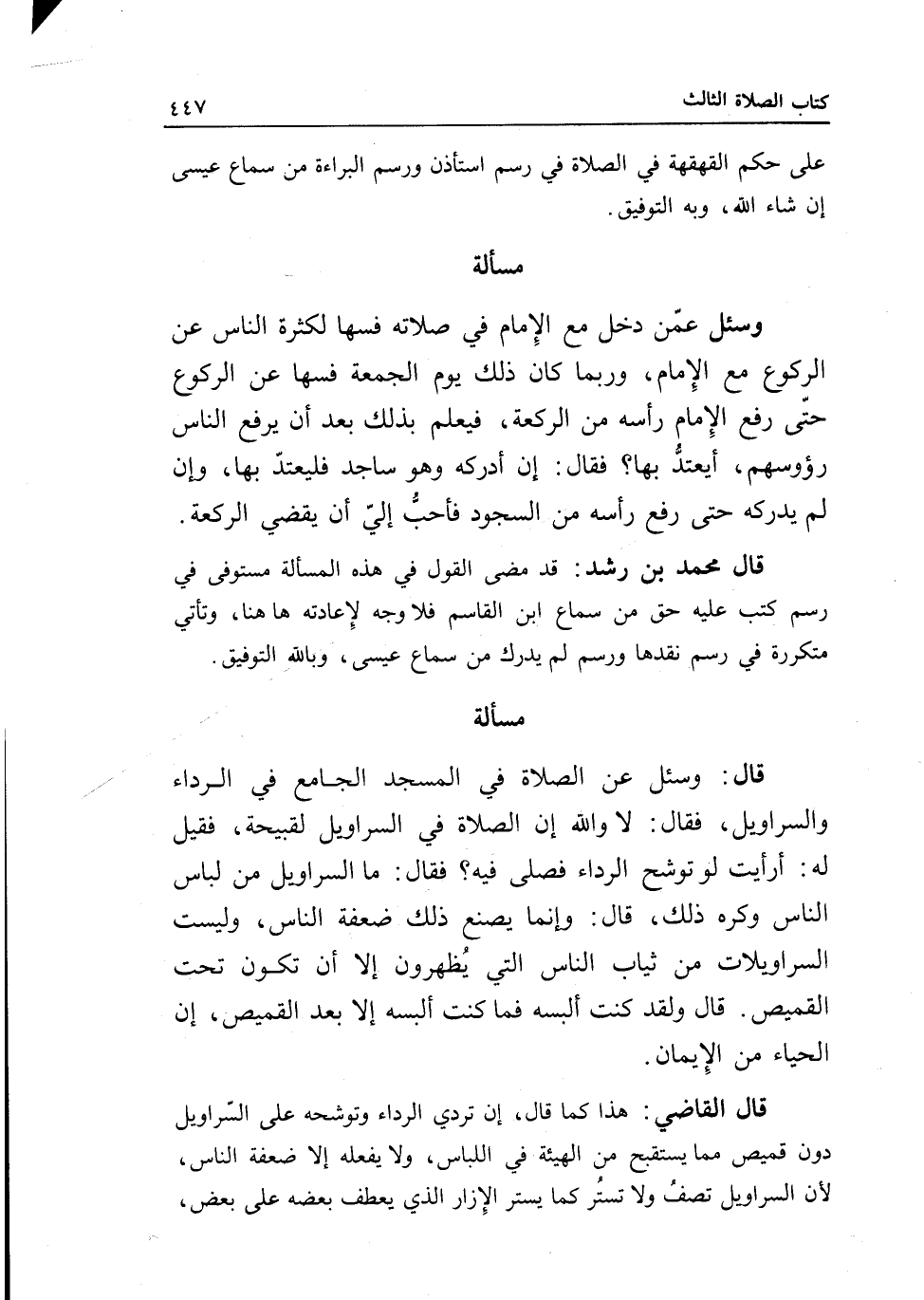 مسألة قال: وسئل عن الصلاة في المسجد الجامع في الرداء والسراويل، فقال: لا والله إن الصلاة في السراويل لقبيحة، فقيل له: أرأيت لو توشح الرداء فصلى فيه؟ فقال: ما السراويل من لباس الناس، وكره ذلك، قال: وإنما يصنع ذلك ضعفة الناس، وليست السراويلات من ثياب الناس التي يظهرون إلا أن تكون تحت القميص. قال: ولقد كنت ألبسه فما كنت ألبسه إلا بعد القميص، إن الحياء من الإيمان.