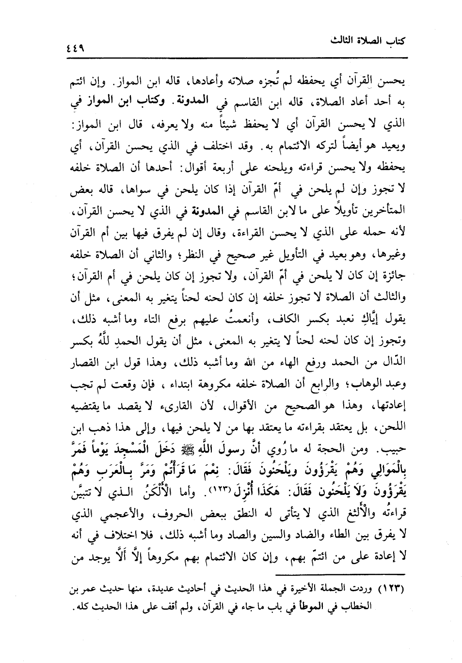 يحسن القرآن أي: يحفظه، لم تجزه صلاته وأعادها، قاله ابن المواز. وإن ائتم به أحد أعاد الصلاة، قاله ابن القاسم في " المدونة ". وكتاب ابن المواز في الذي لا يحسن القرآن أي: لا يحفظ شيئا منه ولا يعرفه، قال ابن المواز: ويعيد هو أيضا؛ لتركه الائتمام به. وقد اختلف في الذي يحسن القرآن، أي: يحفظه ولا يحسن قراءته ويلحنه على أربعة أقوال: أحدها أن الصلاة خلفه لا تجوز، وإن لم يلحن في أم القرآن إذا كان يلحن في سواها، قاله بعض المتأخرين تأويلا على ما لابن القاسم في " المدونة " في الذي لا يحسن القرآن؛ لأنه حمله على الذي لا يحسن القراءة، وقال: إن لم يفرق فيها بين أم القرآن وغيرها، وهو بعيد في التأويل غير صحيح في النظر، والثاني: أن الصلاة خلفه جائزة إن كان لا يلحن في أم القرآن، ولا تجوز إن كان يلحن في أم القرآن، والثالث: أن الصلاة لا تجوز خلفه إن كان لحنه لحنا يتغير به المعنى، مثل أن يقول: {إِيَّاكَ نَعْبُدُ} [الفاتحة: 5] بكسر الكاف، و {أَنْعَمْتَ عَلَيْهِمْ} [الفاتحة: 7] برفع التاء، وما أشبه ذلك، وتجوز إن كان لحنه لحنا لا يتغير به المعنى، مثل أن يقول: {الْحَمْدُ لِلَّهِ} [الفاتحة: 2] بكسر الدال من الحمد ورفع الهاء من الله، وما أشبه ذلك، وهذا قول ابن القصار وعبد الوهاب، والرابع: أن الصلاة خلفه مكروهة ابتداء، فإن وقعت لم تجب إعادتها، وهذا هو الصحيح من الأقوال؛ لأن القارئ لا يقصد ما يقتضيه اللحن، بل يعتقد بقراءته ما يعتقد بها من لا يلحن فيها، وإلى هذا ذهب ابن حبيب. ومن الحجة له ما روي «أن رسول الله - صَلَّى اللَّهُ عَلَيْهِ وَسَلَّمَ - دخل المسجد يوما، فمر بالموالي وهم يقرؤون ويلحنون فقال: نعم ما قرأتم، ومر بالعرب وهم يقرؤون ولا يلحنون فقال: هكذا أنزل» . وأما الألكن الذي لا تتبين قراءته والألثغ الذي لا يتأتى له النطق ببعض الحروف، والأعجمي الذي لا يفرق بين الطاء والضاد والسين والصاد وما أشبه ذلك، فلا اختلاف في أنه لا إعادة على من ائتم بهم، وإن كان الائتمام بهم مكروها إلا ألا يوجد من