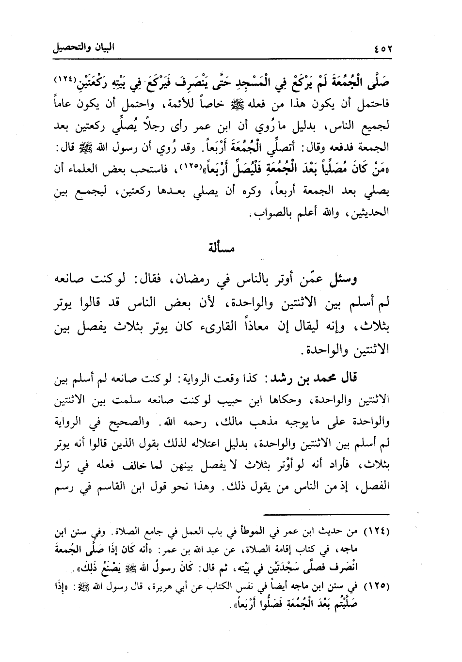 قال محمد بن رشد: كذا وقعت الرواية: لو كنت صانعه لم أسلم بين الاثنتين والواحدة، وحكاها ابن حبيب: لو كنت صانعه سلمت بين الاثنتين والواحدة، على ما يوجبه مذهب مالك - رَحِمَهُ اللَّهُ -. والصحيح في الرواية: لم أسلم بين الاثنتين والواحدة، بدليل اعتلاله لذلك بقول الذين قالوا: إنه يوتر بثلاث، فأراد أنه لو أوتر بثلاث لا يفصل بينهن لما خالف فعله في ترك الفصل؛ إذ من الناس من يقول ذلك. وهذا نحو قول ابن القاسم في رسم