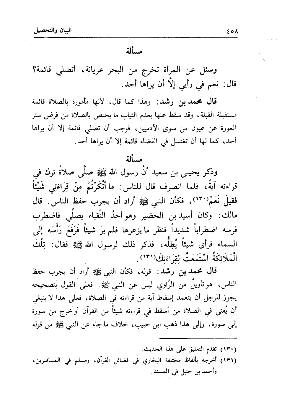 » قال محمد بن رشد: قوله: فكأن النبي - صَلَّى اللَّهُ عَلَيْهِ وَسَلَّمَ - أراد أن يجرب حفظ الناس، هو تأويل من الراوي ليس عن النبي - صَلَّى اللَّهُ عَلَيْهِ وَسَلَّمَ -، فعلى القول بتصحيحه يجوز للرجل أن يتعمد إسقاط آية من قراءته في الصلاة، فعلى هذا لا ينبغي أن يفتى في الصلاة من أسقط في قراءته شيئا من القرآن أو خرج من سورة إلى سورة، وإلى هذا ذهب ابن حبيب، خلاف ما جاء عن النبي - صَلَّى اللَّهُ عَلَيْهِ وَسَلَّمَ - من «قوله