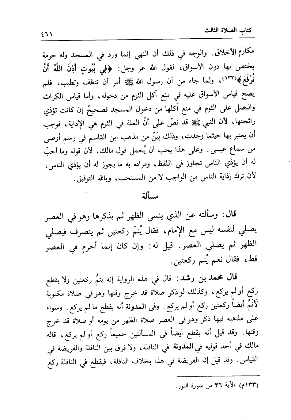 مكارم الأخلاق. والوجه في ذلك أن النهي إنما ورد في المسجد، وله حرمة يختص بها دون الأسواق؛ لقول الله- عز وجل-: {فِي بُيُوتٍ أَذِنَ اللَّهُ أَنْ تُرْفَعَ} [النور: 36] ، ولما جاء من أن رسول الله - صَلَّى اللَّهُ عَلَيْهِ وَسَلَّمَ - أمر أن تنظف وتطيب، فلم يصح قياس الأسواق عليه في منع آكل الثوم من دخوله، وأما قياس الكراث والبصل على الثوم في منع آكلها من دخول المسجد فصحيح إن كانت تؤذي رائحتها؛ لأن النبي - صَلَّى اللَّهُ عَلَيْهِ وَسَلَّمَ - قد نص على أن العلة في الثوم هي الإذاية، فوجب أن يعتبر بها حيثما وجدت، وذلك بين من مذهب ابن القاسم في رسم "أوصى" من سماع عيسى. وعلى هذا يجب أن يحمل قول مالك؛ لأن قوله: وما أحب له أن يؤذي الناس، تجاوز في اللفظ، ومراده به ما يجوز له أن يؤذي الناس؛ لأن ترك إذاية الناس من الواجب لا من المستحب، وبالله التوفيق.
