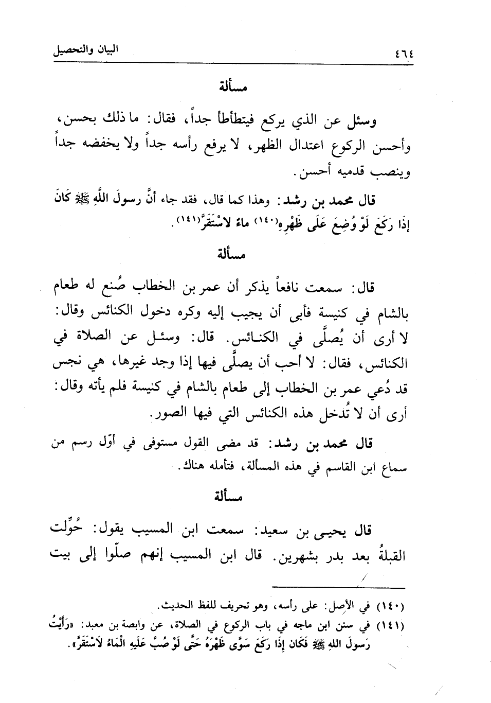 قال محمد بن رشد: وهذا كما قال، فقد جاء أن رسول الله - صَلَّى اللَّهُ عَلَيْهِ وَسَلَّمَ - «كان إذا ركع لو وضع على ظهره ماء لاستقر» .