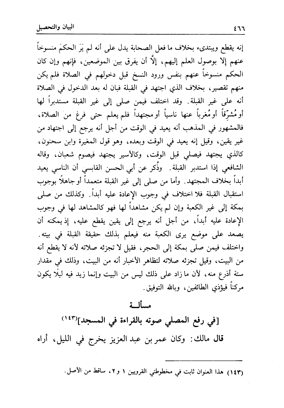 إنه يقطع ويبتدئ بخلاف ما فعل الصحابة يدل على أنه لم ير الحكم منسوخا عنهم إلا بوصول العلم إليهم، إلا أن يفرق بين الموضعين، فإنهم وإن كان الحكم منسوخا عنهم بنفس ورود النسخ قبل دخولهم في الصلاة، فلم يكن منهم تقصير، بخلاف الذي اجتهد في القبلة فبان له بعد الدخول في الصلاة أنه على غير القبلة، وقد اختلف فيمن صلى إلى غير القبلة مستدبرا لها، أو مشرقا أو مغربا عنها، ناسيا أو مجتهدا، فلم يعلم حتى فرغ من الصلاة، فالمشهور في المذهب أنه يعيد في الوقت من أجل أنه يرجع إلى اجتهاد من غير يقين، وقيل: إنه يعيد في الوقت وبعده، وهو قول المغيرة وابن سحنون، كالذي يجتهد فيصلي قبل الوقت، وكالأسير يجتهد فيصوم شعبان، وقاله الشافعي إذا استدبر القبلة. وذكر عن أبي الحسن القابسي أن الناسي يعيد أبدا بخلاف المجتهد. وأما من صلى إلى غير القبلة متعمدا أو جاهلا بوجوب استقبال القبلة، فلا اختلاف في وجوب الإعادة عليه أبدا، وكذلك من صلى بمكة إلى غير الكعبة وإن لم يكن مشاهدا لها فهو كالمشاهد لها في وجوب الإعادة عليه أبدا، من أجل أنه يرجع إلى يقين يقطع عليه، إذ يمكنه أن يصعد على موضع يرى الكعبة منه فيعلم بذلك حقيقة القبلة في بيته. واختلف فيمن صلى بمكة إلى الحجر، فقيل: لا تجزئه صلاته؛ لأنه لا يقطع أنه من البيت، وقيل: تجزئه صلاته؛ لتظاهر الأخبار أنه من البيت، وذلك في مقدار ستة أذرع منه؛ لأن ما زاد على ذلك ليس من البيت، وإنما زيد فيه لئلا يكون مركنا فيؤذي الطائفين، وبالله التوفيق.