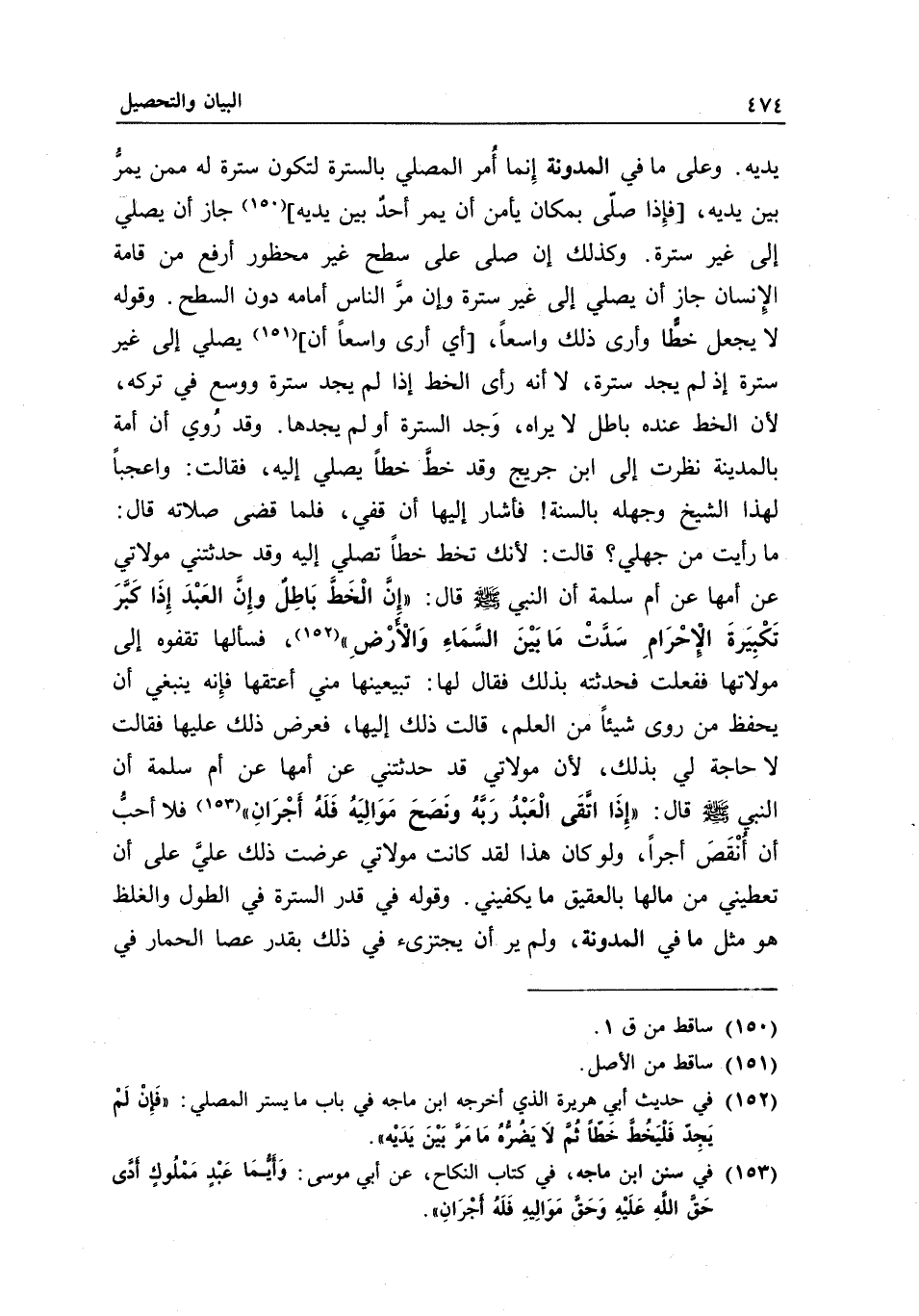 يديه. وعلى ما في " المدونة " إنما أمر المصلي بالسترة؛ لتكون سترة له ممن يمر بين يديه، [فإذا صلى بمكان يأمن أن يمر أحد بين يديه] جاز أن يصلي إلى غير سترة. وكذلك إن صلى على سطح غير محظور أرفع من قامة الإنسان جاز أن يصلي إلى غير سترة وإن مر الناس أمامه دون السطح. وقوله: لا يجعل خطا وأرى ذلك واسعا، [أي أرى واسعا أن] يصلي إلى غير سترة إذ لم يجد سترة، لا أنه رأى الخط إذا لم يجد سترة ووسع في تركه؛ لأن الخط عنده باطل لا يراه، وجد السترة أو لم يجدها. وقد روي أن أمة بالمدينة نظرت إلى ابن جريج وقد خط خطا يصلي إليه، فقالت: واعجبا لهذا الشيخ وجهله بالسنة! فأشار إليها أن قفي، فلما قضى صلاته قال: ما رأيت من جهلي؟ قالت: لأنك تخط خطا تصلي إليه، وقد حدثتني مولاتي عن أمها عن أم سلمة أن النبي - صَلَّى اللَّهُ عَلَيْهِ وَسَلَّمَ - قال: «إن الخط باطل، وإن العبد إذا كبر تكبيرة الإحرام سدت ما بين السماء والأرض» ، فسألها تقفوه إلى مولاتها ففعلت، فحدثته بذلك فقال لها: تبيعينها مني أعتقها، فإنه ينبغي أن يحفظ من روى شيئا من العلم، قالت: ذلك إليها، فعرض ذلك عليها فقالت: لا حاجة لي بذلك؛ لأن مولاتي قد حدثتني عن أمها عن أم سلمة أن النبي - صَلَّى اللَّهُ عَلَيْهِ وَسَلَّمَ - قال: «إذا اتقى العبد ربه ونصح مواليه فله أجران» فلا أحب أن أنقص أجرا، ولو كان هذا لقد كانت مولاتي عرضت ذلك علي على أن تعطيني من مالها بالعقيق ما يكفيني. وقوله في قدر السترة في الطول والغلظ هو مثل ما في " المدونة "، ولم ير أن يجتزئ في ذلك بقدر عصا الحمار في