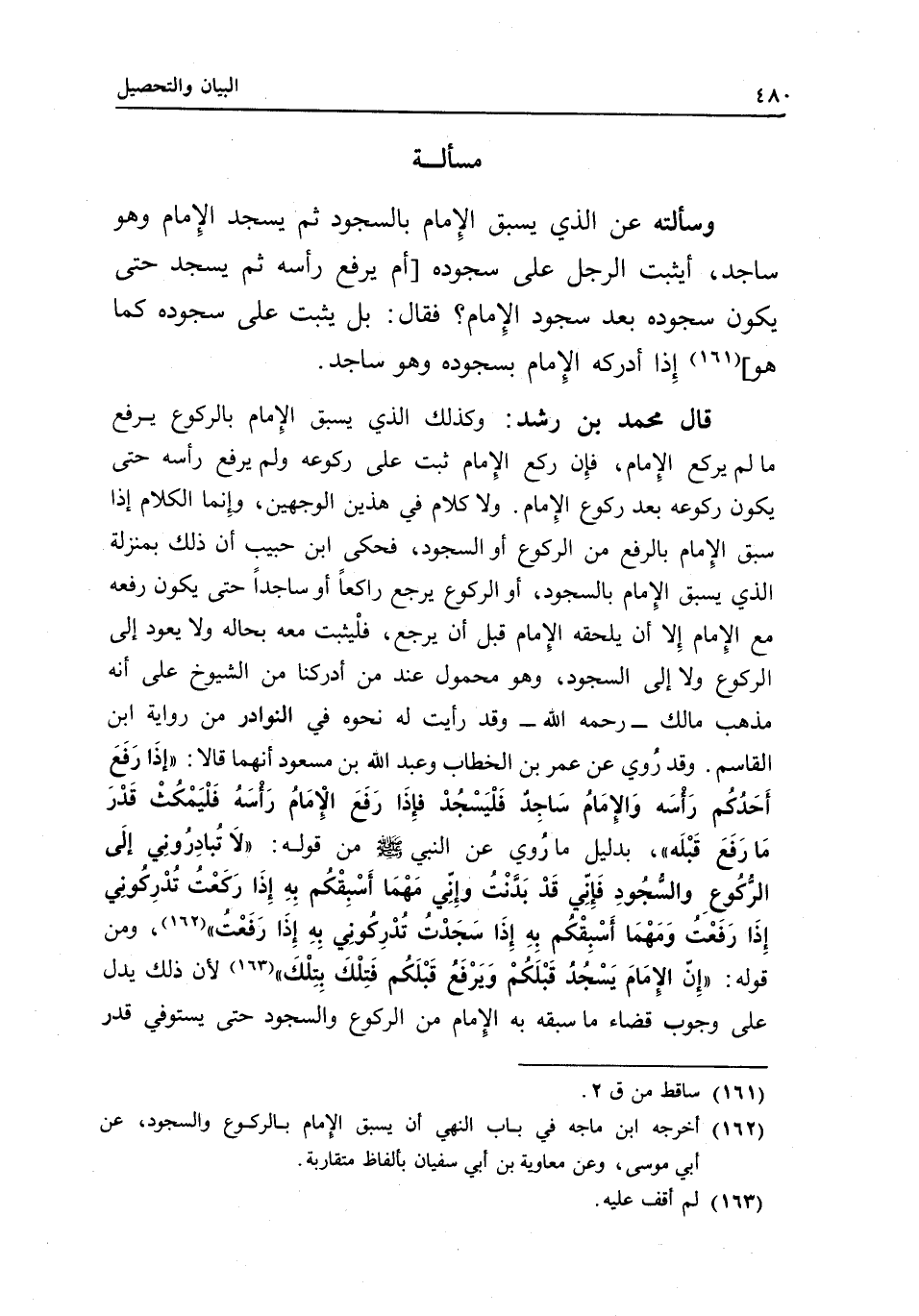 قال محمد بن رشد: وكذلك الذي يسبق الإمام بالركوع يرفع ما لم يركع الإمام، فإن ركع الإمام ثبت على ركوعه ولم يرفع رأسه حتى يكون ركوعه بعد ركوع الإمام. ولا كلام في هذين الوجهين، وإنما الكلام إذا سبق الإمام بالرفع من الركوع أو السجود، فحكى ابن حبيب أن ذلك بمنزلة الذي يسبق الإمام بالسجود أو الركوع، يرجع راكعا أو ساجدا حتى يكون رفعه مع الإمام، إلا أن يلحقه الإمام قبل أن يرجع، فليثبت معه بحاله ولا يعود إلى الركوع ولا إلى السجود، وهو محمول عند من أدركنا من الشيوخ على أنه مذهب مالك - رَحِمَهُ اللَّهُ - وقد رأيت له نحوه في " النوادر " من رواية ابن القاسم. وقد روي عن عمر بن الخطاب وعبد الله بن مسعود أنهما قالا: "إذا رفع أحدكم رأسه والإمام ساجد فليسجد، فإذا رفع الإمام رأسه فليمكث قدر ما رفع قبله"، بدليل ما روي عن النبي - صَلَّى اللَّهُ عَلَيْهِ وَسَلَّمَ - من قوله: «لا تبادروني إلى الركوع والسجود، فإني قد بدنت، وإني مهما أسبقكم به إذا ركعت تدركوني إذا رفعت، ومهما أسبقكم به إذا سجدت تدركوني به إذا رفعت» ، ومن قوله: «إن الإمام يسجد قبلكم ويرفع قبلكم فتلك بتلك» ؛ لأن ذلك يدل على وجوب قضاء ما سبقه به الإمام من الركوع والسجود حتى يستوفي قدر