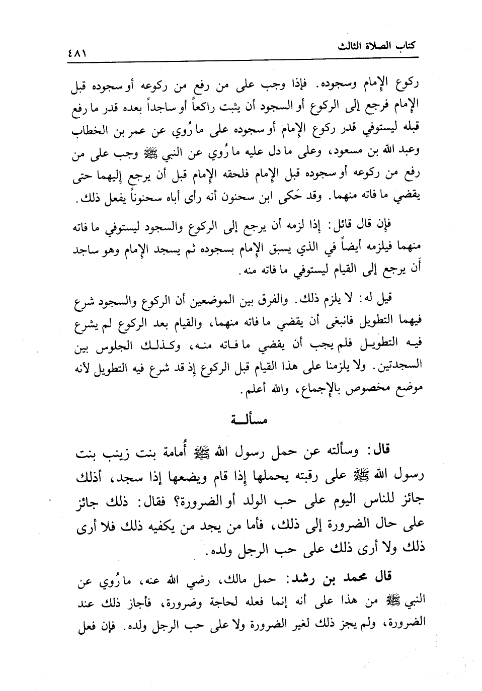 مسألة قال: وسألته عن حمل رسول الله - صَلَّى اللَّهُ عَلَيْهِ وَسَلَّمَ - أمامة بنت زينب بنت رسول الله - صَلَّى اللَّهُ عَلَيْهِ وَسَلَّمَ - على رقبته يحملها إذا قام ويضعها إذا سجد، أذلك جائز للناس اليوم على حب الولد أو الضرورة؟ فقال: ذلك جائز على حال الضرورة إلى ذلك، فأما من يجد من يكفيه ذلك فلا أرى ذلك ولا أرى ذلك على حب الرجل ولده.