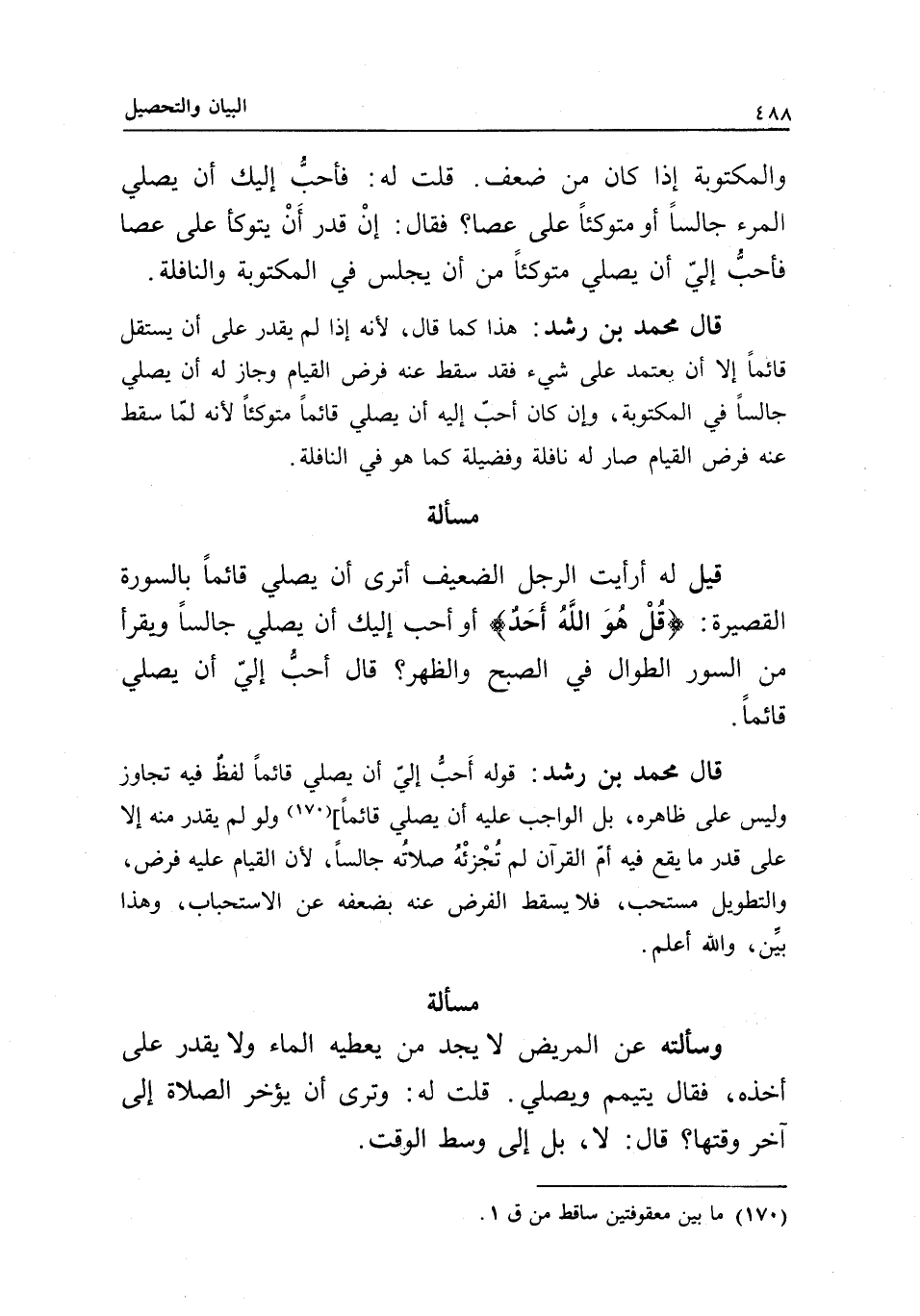 مسألة قيل له: أرأيت الرجل الضعيف أترى أن يصلي قائما بالسورة القصيرة: {قُلْ هُوَ اللَّهُ أَحَدٌ} [الإخلاص: 1] ، أو أحب إليك أن يصلي جالسا ويقرأ من السور الطوال في الصبح والظهر؟ قال: أحب إلي أن يصلي قائما.