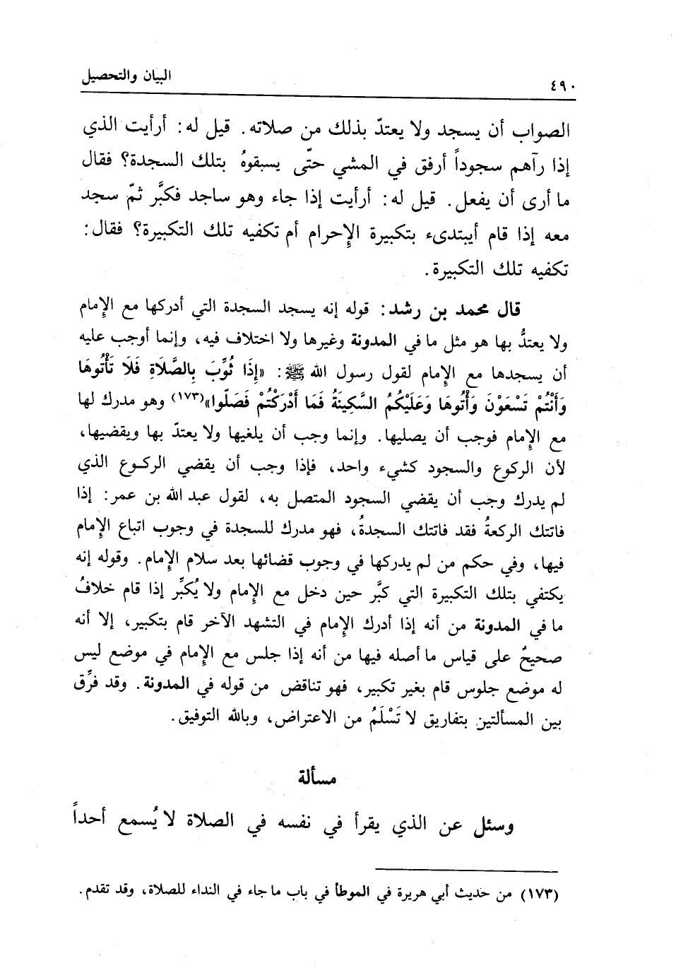 مسألة وسئل عن الذي يقرأ في نفسه في الصلاة لا يسمع أحدا
