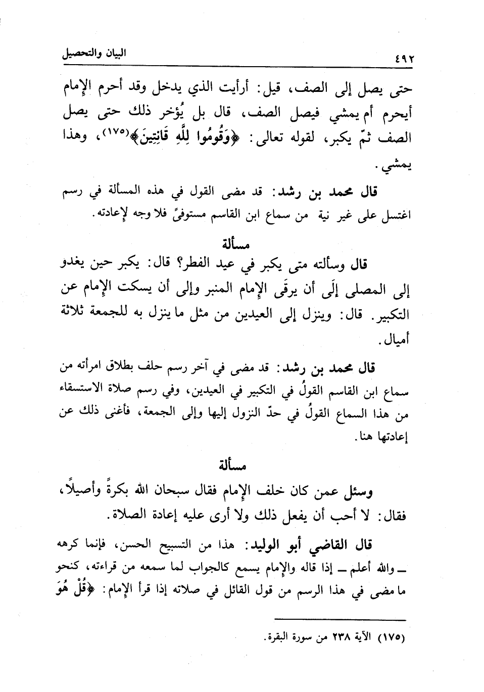قال محمد بن رشد: قد مضى في آخر رسم "حلف بطلاق امرأته" من سماع ابن القاسم القول في التكبير في العيدين، وفي رسم "صلاة الاستسقاء " من هذا السماع القول في حد النزول إليها وإلى الجمعة، فأغنى ذلك عن إعادتها هنا.