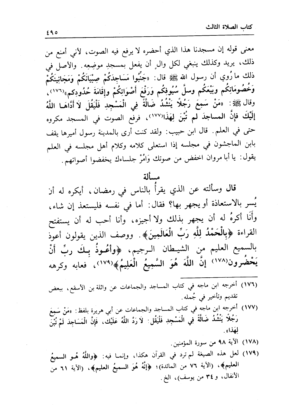 والأصل في ذلك ما روي أن رسول الله - صَلَّى اللَّهُ عَلَيْهِ وَسَلَّمَ - قال: «جنبوا مساجدكم صبيانكم ومجانينكم وخصوماتكم وبيعكم وسل سيوفكم ورفع أصواتكم وإقامة حدودكم» ، وقال - صَلَّى اللَّهُ عَلَيْهِ وَسَلَّمَ -: «من سمع رجلا ينشد ضالة في المسجد فليقل لا أداها الله إليك فإن المساجد لم تبن لهذا» ، فرفع الصوت في المسجد مكروه حتى في العلم.