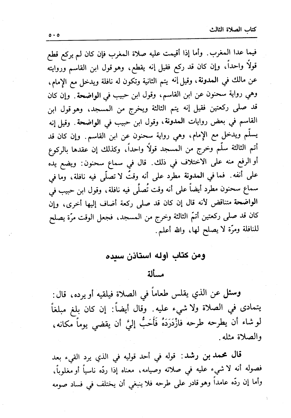 فما في " المدونة " مطرد على أنه وقت لا تصلى فيه نافلة، وما في سماع سحنون مطرد أيضا على أنه وقت تصلى فيه نافلة، وقول ابن حبيب في الواضحة متناقض؛ لأنه قال: إن كان قد صلى ركعة أضاف إليها أخرى، وإن كان قد صلى ركعتين أتم الثالثة وخرج من المسجد، فجعل الوقت مرة يصلح للنافلة ومرة لا يصلح لها، والله أعلم.