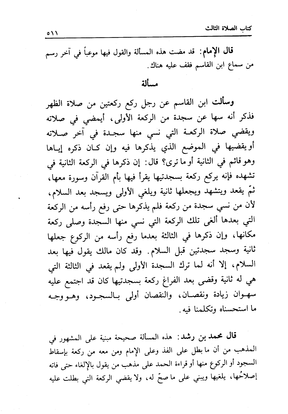 قال محمد بن رشد: هذه المسألة صحيحة مبنية على المشهور في المذهب من أن ما بطل على الفذ وعلى الإمام ومن معه من ركعة بإسقاط السجود أو الركوع منها أو قراءة الحمد على مذهب من يقول بالإلغاء حتى فاته إصلاحها، يلغيها ويبني على ما صح له، ولا يقضي الركعة التي بطلت عليه