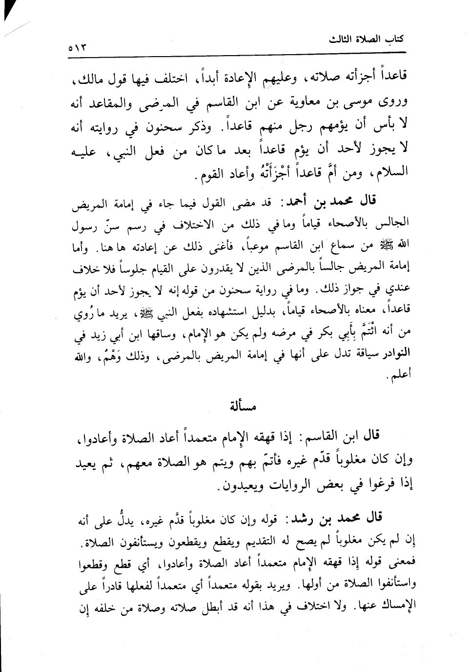 وما في رواية سحنون من قوله إنه لا يجوز لأحد أن يؤم قاعدا، معناه بالأصحاء قياما، بدليل استشهاده بفعل النبي - صَلَّى اللَّهُ عَلَيْهِ وَسَلَّمَ - يريد ما روي: من أنه ائتم بأبي بكر في مرضه ولم يكن هو الإمام، وساقها ابن أبي زيد في النوادر سياقة تدل على أنها في إمامة المريض بالمرضى، وذلك وهم، والله أعلم.