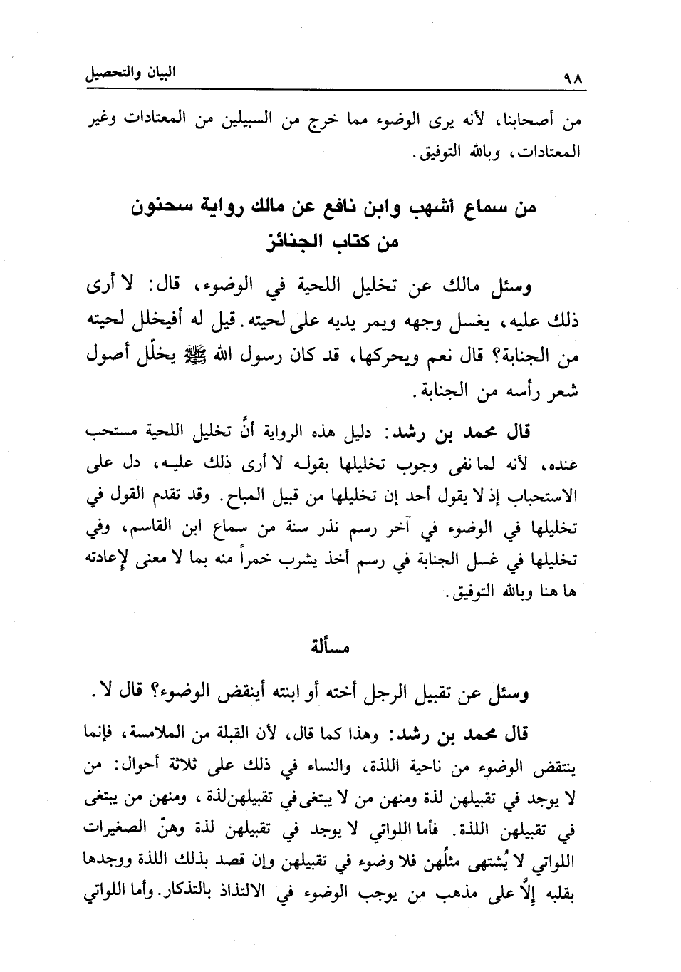 مسألة وسئل عن تقبيل الرجل أخته أو ابنته أينقض الوضوء؟ قال: لا.