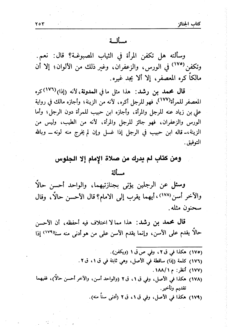 مسألة وسألته هل تكفن المرأة في الثياب المصبوغة؟ قال: نعم، وتكفن في الورس، والزعفران، وغير ذلك من الألوان، إلا أن مالكا كره المعصفر، إلا ألا يجد غيره.
