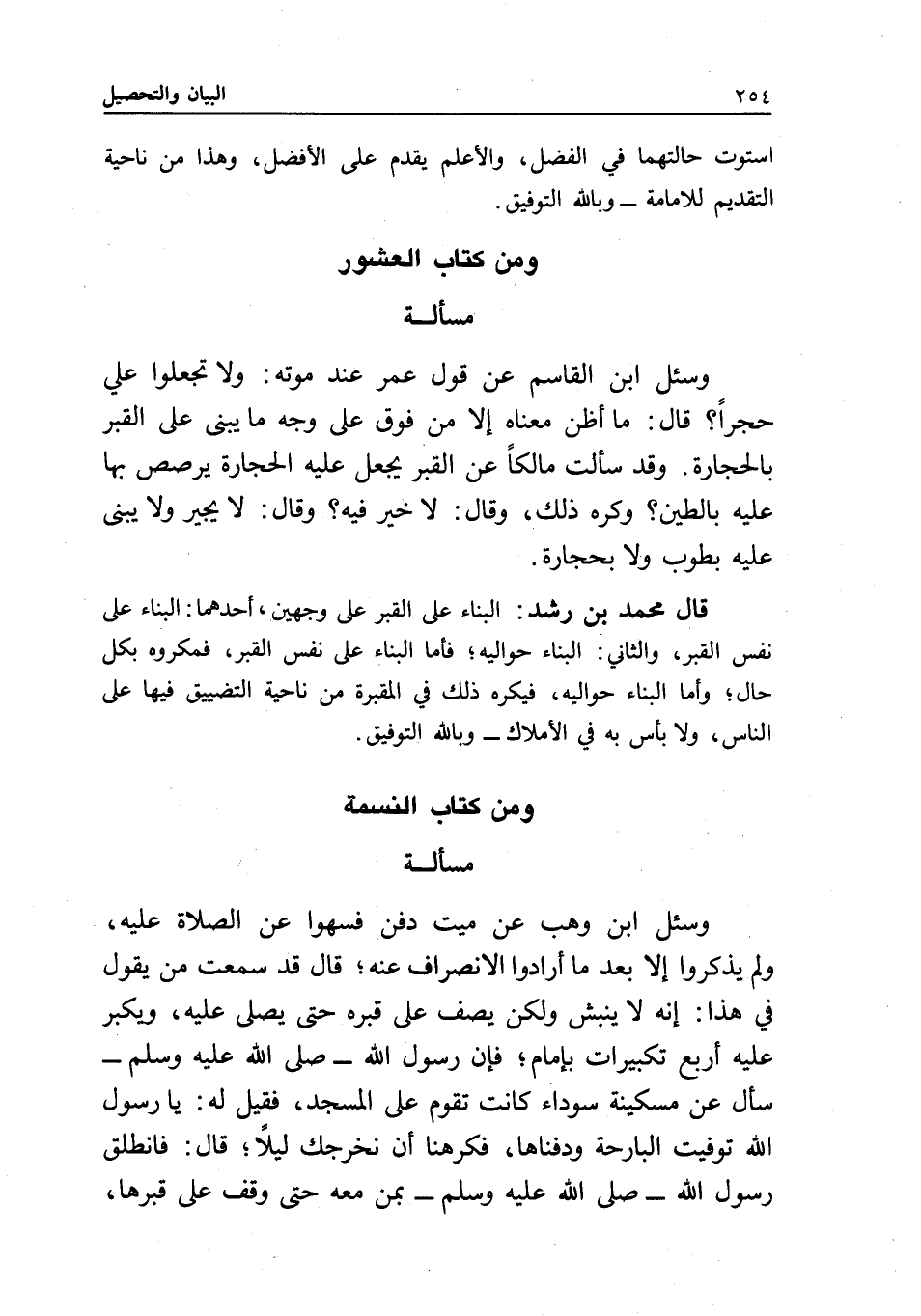 قال محمد بن رشد: البناء على القبر على وجهين؛ أحدهما: البناء على نفس القبر، والثاني: البناء حواليه؛ فأما البناء على نفس القبر، فمكروه بكل حال؛ وأما البناء حواليه، فيكره ذلك في المقبرة من ناحية التضييق فيها على الناس، ولا بأس به في الأملاك - وبالله التوفيق.