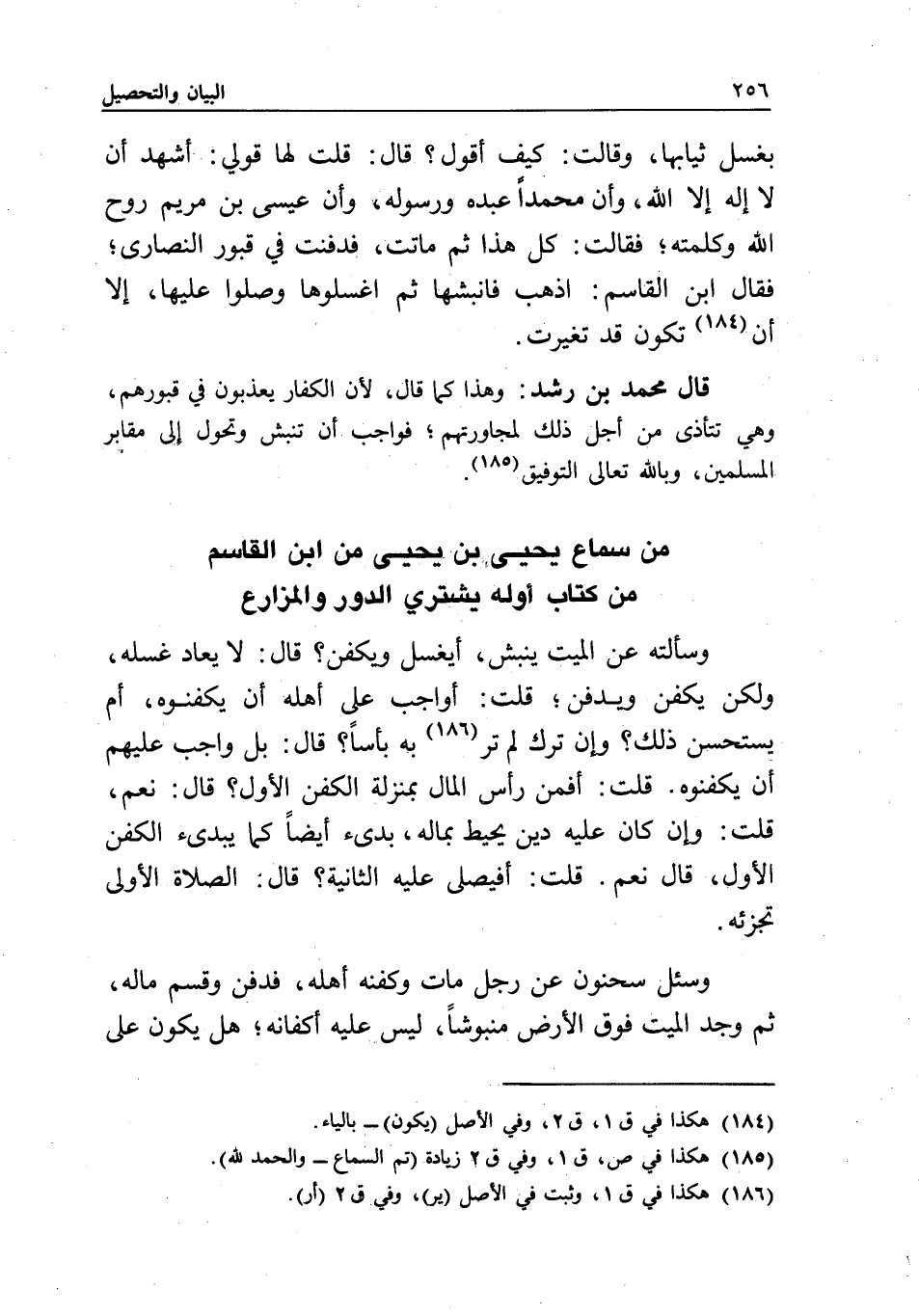 بغسل ثيابها، وقالت: كيف أقول؟ قال: قلت لها قولي: أشهد أن لا إله إلا الله، وأن محمدا عبده ورسوله، وأن عيسى ابن مريم روح الله وكلمته؛ فقالت: كل هذا ثم ماتت، فدفنت في قبور النصارى؛ فقال ابن القاسم: اذهب فانبشها، ثم اغسلوها وصلوا عليها، إلا أن تكون قد تغيرت.