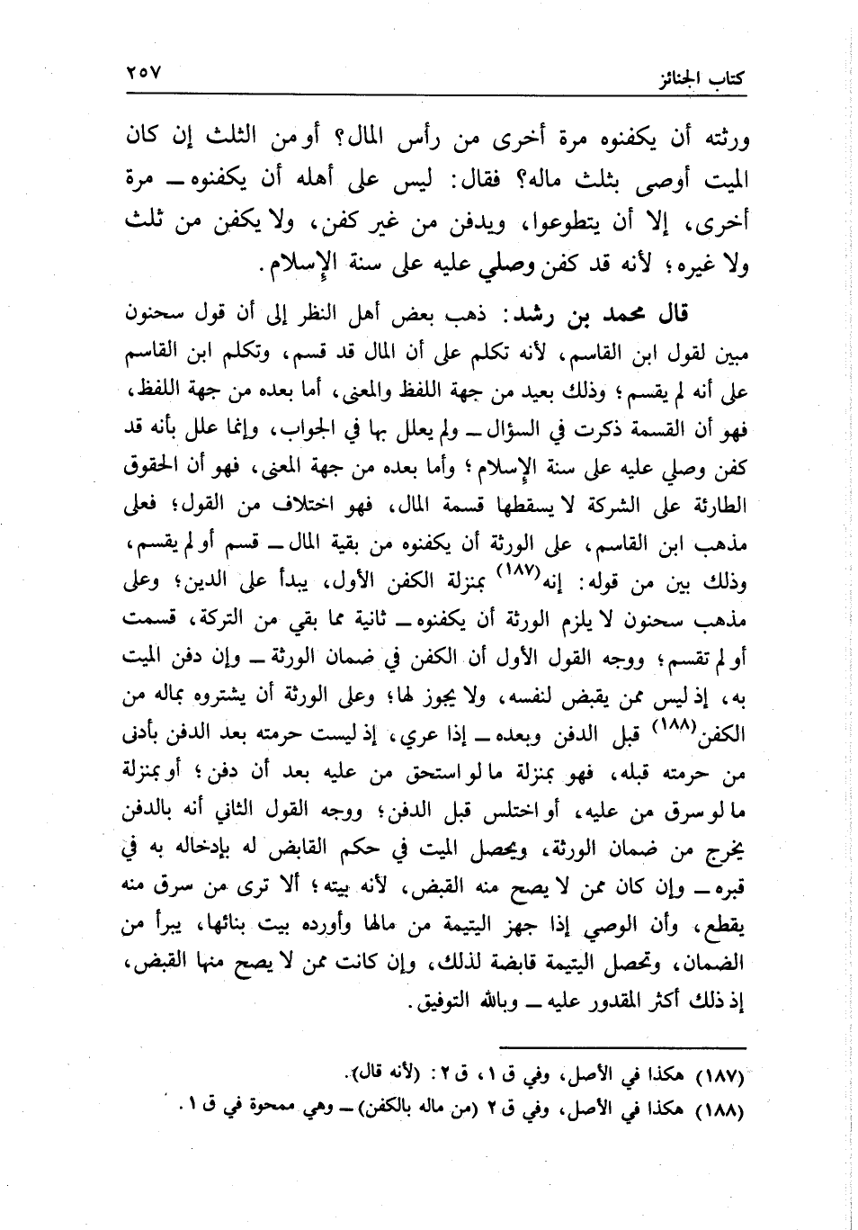 قال محمد بن رشد: ذهب بعض أهل النظر إلى أن قول سحنون مبين لقول ابن القاسم؛ لأنه تكلم على أن المال قد قسم، وتكلم ابن القاسم على أنه لم يقسم، وذلك بعيد من جهة اللفظ والمعنى، أما بُعْده من جهة اللفظ، فهو أن القسمة ذُكرت في السؤال - ولم يعلل بها في الجواب، وإنما علل بأنه قد كفن وصلي عليه على سنة الإسلام، وأما بعده من جهة المعنى، فهو أن الحقوق الطارئة على الشركة لا يُسقطها قسمة المال، فهو اختلاف من القول.