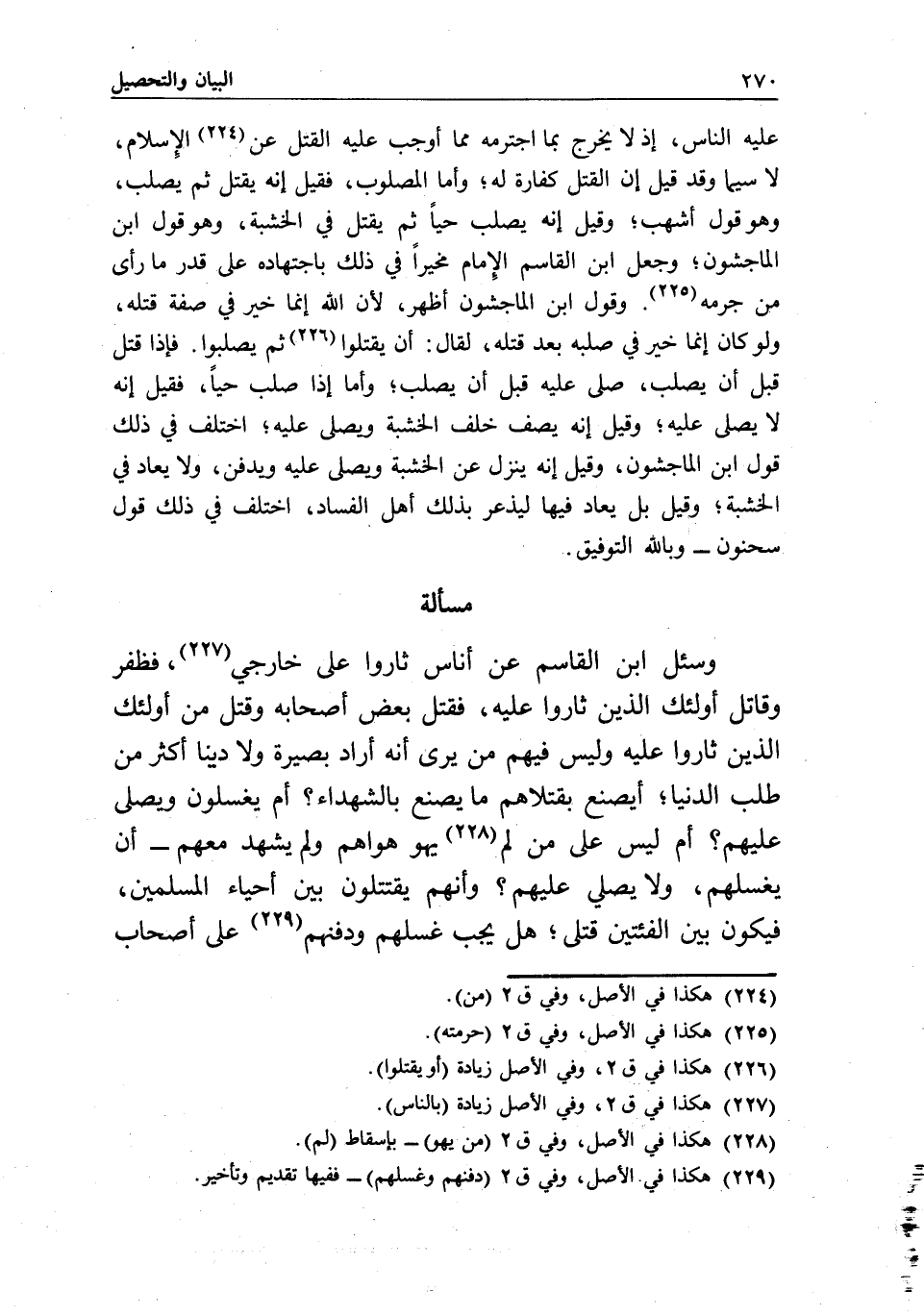 مسألة وسئل ابن القاسم: عن أناس ثاروا على خارجي، فظفر وقاتل أولئك الذين ثاروا عليه، فقتل بعض أصحابه وقتل من أولئك الذين ثاروا عليه وليس فيهم من يرى أنه أراد بصيرة ولا دينا أكثر من طلب الدنيا؛ أيصنع بقتلاهم ما يصنع بالشهداء؟ أم يغسلون ويصلى عليهم؟ أم ليس على من لم يهو هواهم ولم يشهد معهم - أن يغسلهم، ولا يصلي عليهم؟ وأنهم يقتتلون بين أحياء المسلمين، فيكون بين الفئتين قتلى؛ هل يجب غسلهم ودفنهم على أصحاب