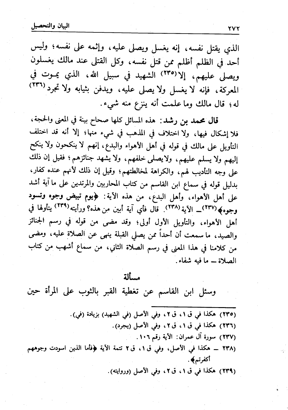 قال محمد بن رشد: هذه المسائل كلها صحاح بينة في المعنى والحجة، فلا إشكال فيها، ولا اختلاف في المذهب في شيء منها؛ إلا أنه قد اختلف التأويل على مالك في قوله في أهل الأهواء والبدع، إنهم لا ينكحون ولا ينكح إليهم ولا يسلم عليهم، ولا يصلى خلفهم، ولا يشهد جنائزهم، فقيل: إن ذلك على وجه التأديب لهم، والكراهة لمخالطتهم، وقيل: إن ذلك لأنهم عنده كفار، بدليل قوله في سماع ابن القاسم من كتاب المحاربين والمرتدين على ما آية أشد على أهل الأهواء وأهل البدع، من هذه الآية: {يَوْمَ تَبْيَضُّ وُجُوهٌ وَتَسْوَدُّ وُجُوهٌ} [آل عمران: 106] ... الآية. قال: فأي آية أبين من هذه؟ ورأيته يتأولها في أهل الأهواء، والتأويل الأول أولى؛ وقد مضى من قوله في رسم "الجنائز والصيد"، ما سمعت أن أحدا ممن يصلي القبلة ينهى عن الصلاة عليه، ومضى من كلامنا في هذا المعنى في رسم "الصلاة" الثاني، من سماع أشهب من كتاب الصلاة - ما فيه شفاء.