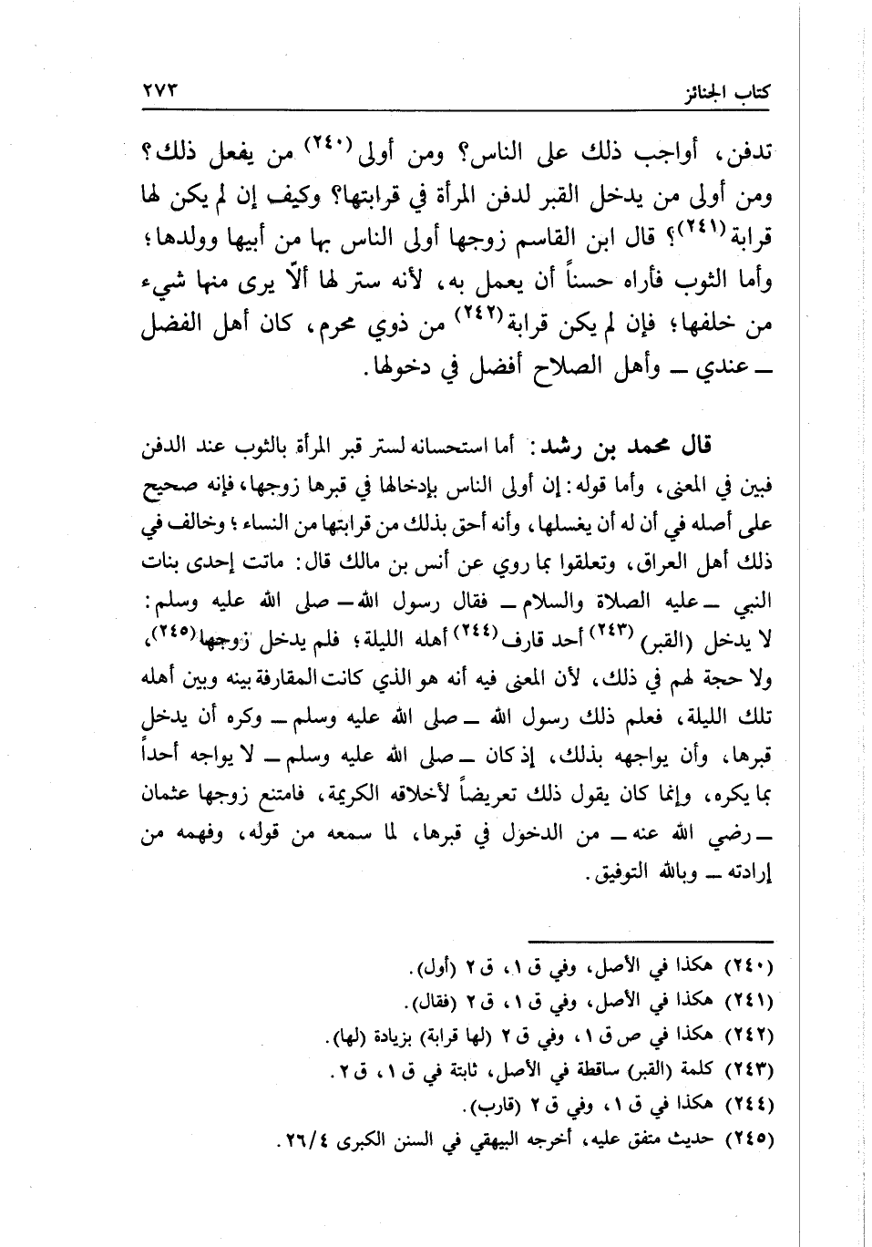 قال محمد بن رشد: أما استحسانه لستر قبر المرأة بالثوب عند الدفن فبين في المعنى، وأما قوله: إن أولى الناس بإدخالها في قبرها زوجها، فإنه صحيح على أصله في أن له أن يغسلها، وأنه أحق بذلك من قرابتها من النساء، وخالف في ذلك أهل العراق، وتعلقوا بما روي عن أنس بن مالك قال: «ماتت إحدى بنات النبي - عَلَيْهِ الصَّلَاةُ وَالسَّلَامُ - فقال رسول الله - صَلَّى اللَّهُ عَلَيْهِ وَسَلَّمَ -: "لا يدخل القبر أحد قارف أهله الليلة» ؛ فلم يدخل زوجها، ولا حجة لهم في ذلك؛ لأن المعنى فيه أنه هو الذي كانت المقارفة بينه وبين أهله تلك الليلة، فعلم ذلك رسول الله - صَلَّى اللَّهُ عَلَيْهِ وَسَلَّمَ - وكره أن يدخل قبرها؛ وأن يواجهه بذلك، إذ كان - صَلَّى اللَّهُ عَلَيْهِ وَسَلَّمَ - لا يواجه أحدا بما يكره، وإنما كان يقول ذلك تعريضا لأخلاقه الكريمة، فامتنع زوجها عثمان - رَضِيَ اللَّهُ عَنْهُ - من الدخول في قبرها، لما سمعه من قوله، وفهمه من إرادته - وبالله التوفيق.
