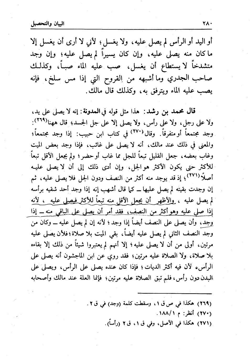 قال محمد بن رشد: هذا مثل قوله في المدونة: إنه لا يصلى على يد، ولا على رجل، ولا على رأس، ولا يصلى إلا على جل الجسد. قال هاهنا: وجد مجتمعا أو متفرقا. وقال في كتاب ابن حبيب: إذا وجد مجتمعا؛ والمعنى في ذلك عند مالك: أنه لا يصلى على غائب، فإذا وجد بعض الميت وغاب بعضه، جعل القليل تبعا للجل مما غاب أو حضر، ولم يجعل الأقل تبعا للأكثر حتى يكون الأكثر هو الجل، وإن أدى ذلك إلى أن لا يصلى عليه أصلا؛ إذ قد يوجد منه أكثر من النصف ودون الجل فلا يصلى عليه، ثم إن وجدت بقيته لم يصل عليها - كما قال أشهب: إنه إذا وجد أحد شقيه برأسه لم يصل عليه، والأظهر أن يجعل الأقل منه تبعا للأكثر فيصلى عليه؛ لأنه إذا صلي عليه وهو أكثر من النصف، فقد أمر أن يصلى على الباقي منه - إذا وجد، وأن يصلى على النصف أيضا إذا وجد؛ لأنه إن لم يصل عليه - وكان من وجد النصف الثاني لم يصل عليه أيضا، بقي الميت بلا صلاة؛ فلأن يصلى عليه مرتين، أولى من أن لا يصلى عليه؛ إلا أنهم لم يعتبروا شيئا من ذلك إلا بقاءه بلا صلاة، ولا الصلاة عليه مرتين، فقد روي عن ابن الماجشون: أنه يصلى على الرأس؛ لأن فيه أكثر الديات، فإذا كان عنده يصلى على الرأس، ويصلى على البدن دون رأس، فلم تبق الصلاة عليه مرتين. فإنما العلة عند مالك وأصحابه