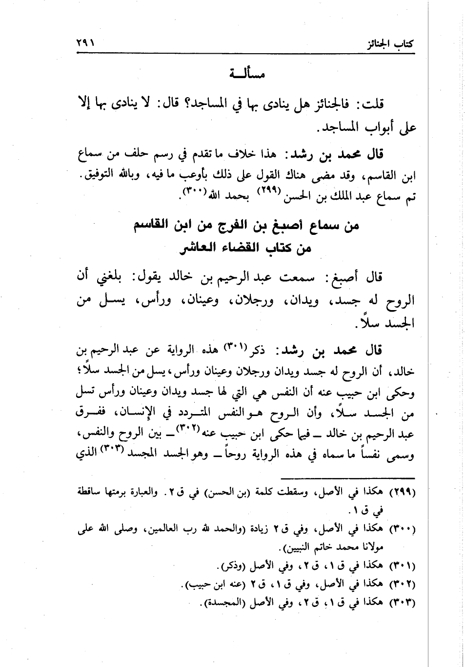 قال محمد بن رشد: ذكر هذه الرواية عن عبد الرحيم بن خالد، أن الروح له جسد ويدان ورجلان وعينان ورأس، يسل من الجسد سلا. وحكى ابن حبيب عنه: أن النفس هي التي لها جسد ويدان وعينان ورأس تسل من الجسد سلا، وأن الروح هو النفس المتردد في الإنسان، ففرق عبد الرحيم بن خالد - فيما حكى ابن حبيب عنه - بين الروح والنفس، وسمى نفسا ما سماه في هذه الرواية روحا - وهو الجسد المجسد الذي