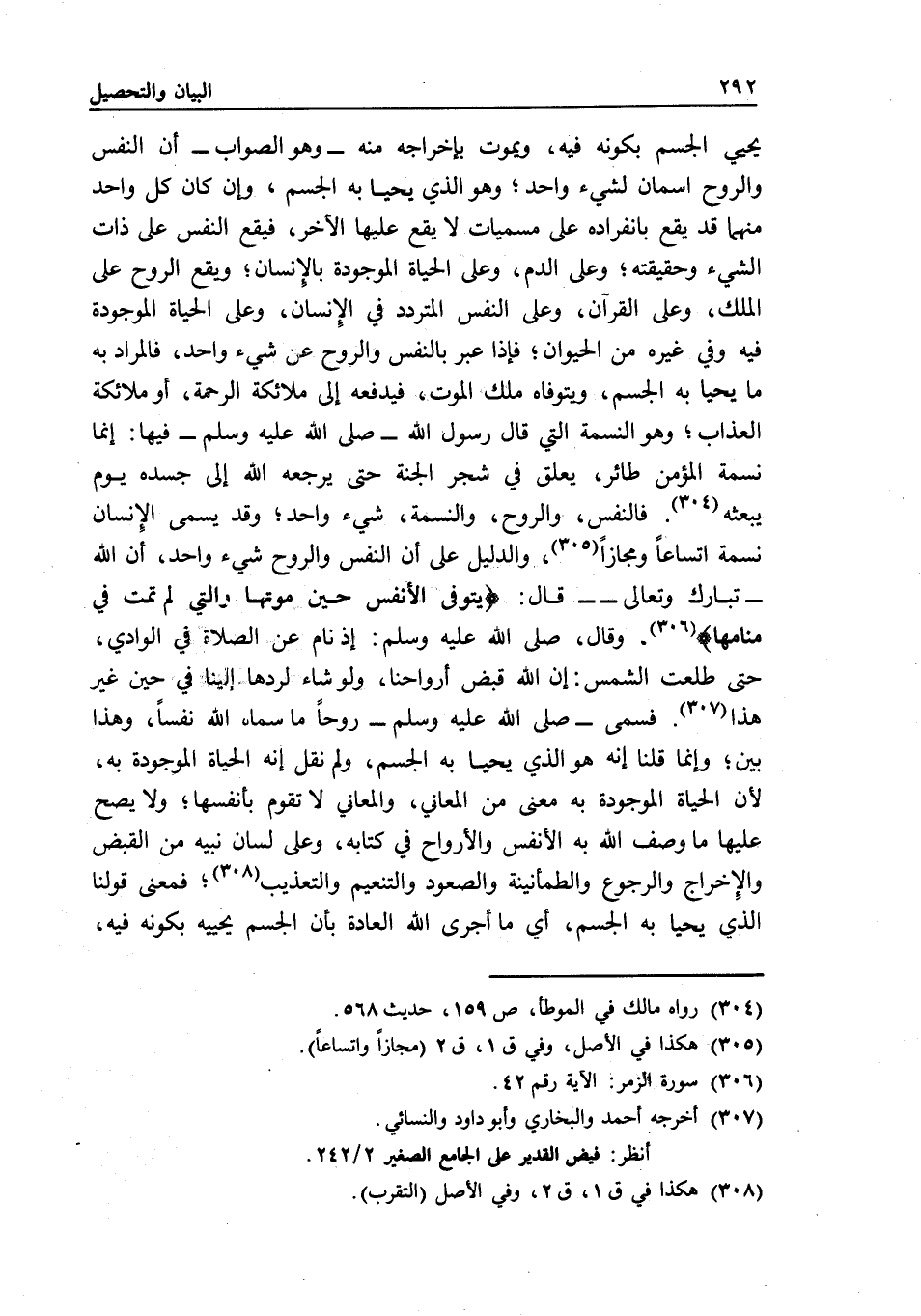 فالنفس، والروح، والنسمة، شيء واحد؛ وقد يسمى الإنسان نسمة اتساعا ومجازا. والدليل على أن النفس والروح شيء واحد: أن الله - تبارك وتعالى - قال: {يَتَوَفَّى الأَنْفُسَ حِينَ مَوْتِهَا وَالَّتِي لَمْ تَمُتْ فِي مَنَامِهَا} [الزمر: 42] . وقال - صَلَّى اللَّهُ عَلَيْهِ وَسَلَّمَ -؛ إذ نام عن الصلاة في الوادي، حتى طلعت الشمس: «إن الله قبض أرواحنا، ولو شاء لردها إلينا في حين غير هذا» . فسمى - صَلَّى اللَّهُ عَلَيْهِ وَسَلَّمَ - روحا ما سماه الله نفسا، وهذا بين، وإنما قلنا إنه هو الذي يحيا به الجسم، ولم نقل إنه الحياة الموجودة به؛ لأن الحياة الموجودة به معنى من المعاني، والمعاني لا تقوم بأنفسها، ولا يصح عليها ما وصف الله به الأنفس والأرواح في كتابه، وعلى لسان نبيه من القبض والإخراج والرجوع والطمأنينة والصعود والتنعيم والتعذيب. فمعنى قولنا: الذي يحيا به الجسم، أي: ما أجرى الله العادة بأن الجسم يحييه بكونه فيه،